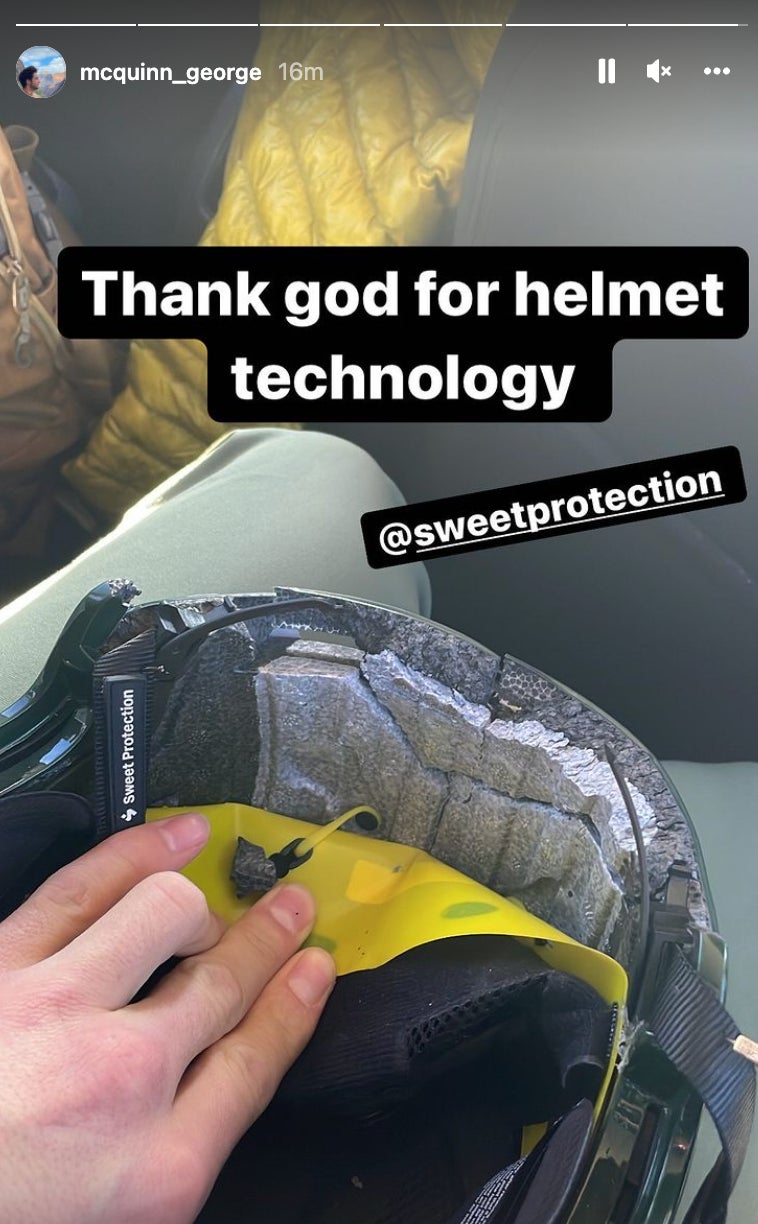 Which 1000% saved his life. I've said it before and I'll say it again, helmets can look goofy, but you have to wear one. Even if you're not going nuts all it takes is one bad fall and you're fucked. Also, stay off the moguls. I get that they were part of the competition, but nothing good ever comes from them. All they do is destroy your knees and make you lose control. Anyway, thank God George is okay and if you're skiing this weekend, be careful.