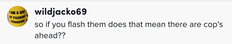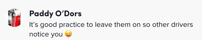 "Your headlights are on. I can see your thingies."