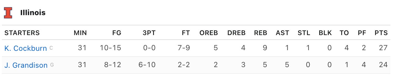 Illinois and Houston are in a class of their own. Meanwhile Gonzaga's head coach hardly misses anything after recklessly endangering his community. It doesn't make any sense and frankly I don't care any more. I welcome the adversity much as I know Brad Underwood welcomes it. That's how you get stronger and propel yourself into March. I can feel it deep inside my loins.