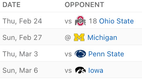 4 games left. Not exactly murderer's row but that doesn't really matter this time of year. Great thing is they control their path to a Big Ten title.