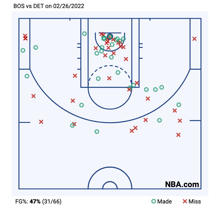 - I'll say it. The Celts had no answer for guarding Cade Cunningham. Smart had him for 19 possessions and gave up 7 points on 2-4 shooting. He lit up Jaylen for 6 points on 3-5. Was 4-4 against Al/Grant. He killed pretty much everyone. I thought the Pistons really exploited a weakness in the Celts defense through the first three quarters and that was the middle of the paint/FT line. Look at the Pistons shot chart through the first three quarters
