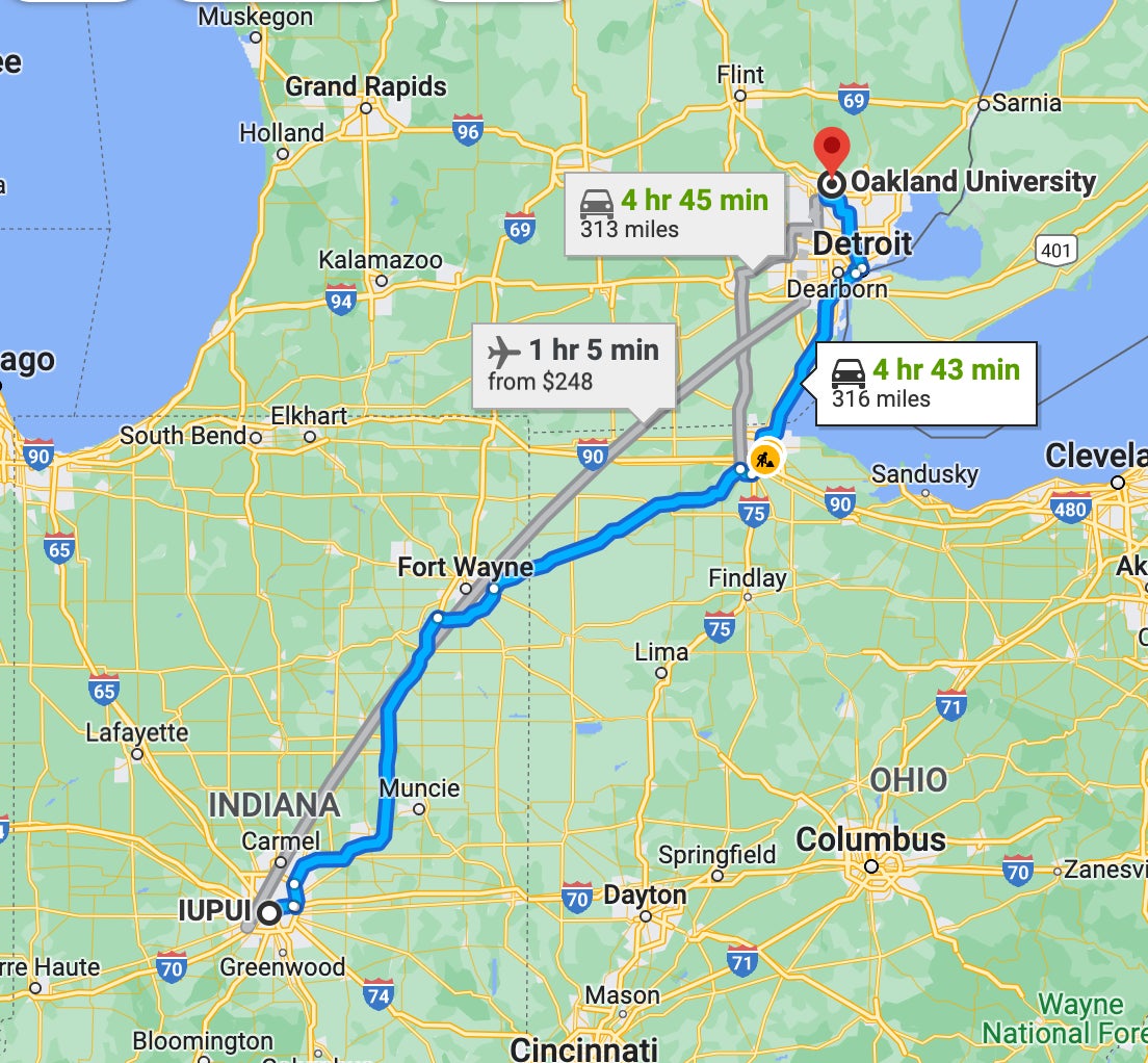 Anything happens in March right? Well, I guess technically this was the last day of February, but still you get my point. IUPUI - the worst team in college basketball, the team that had to play with just 5 guys total yesterday, also apparently went the wrong way. They were driving to Michigan from Indianapolis. Thanks to technology I can show you the route: