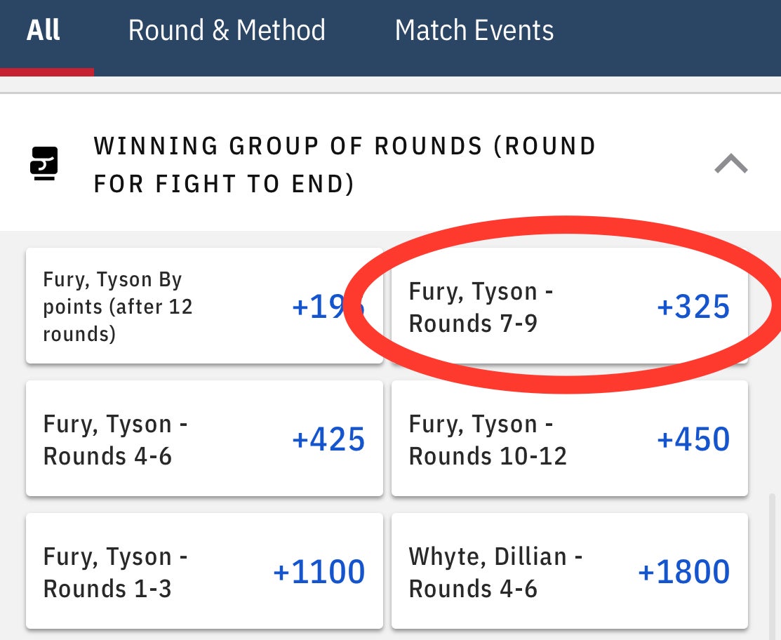 The over/under is 9.5 Rounds, but I will take a stab at tightening that up a little by taking a Fury victory in either 7,8, or 9 at +350 on the Barstool Sportsbook.