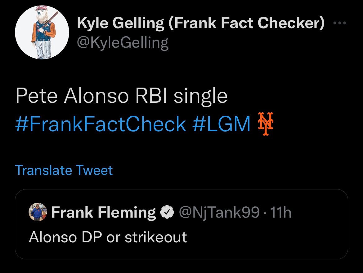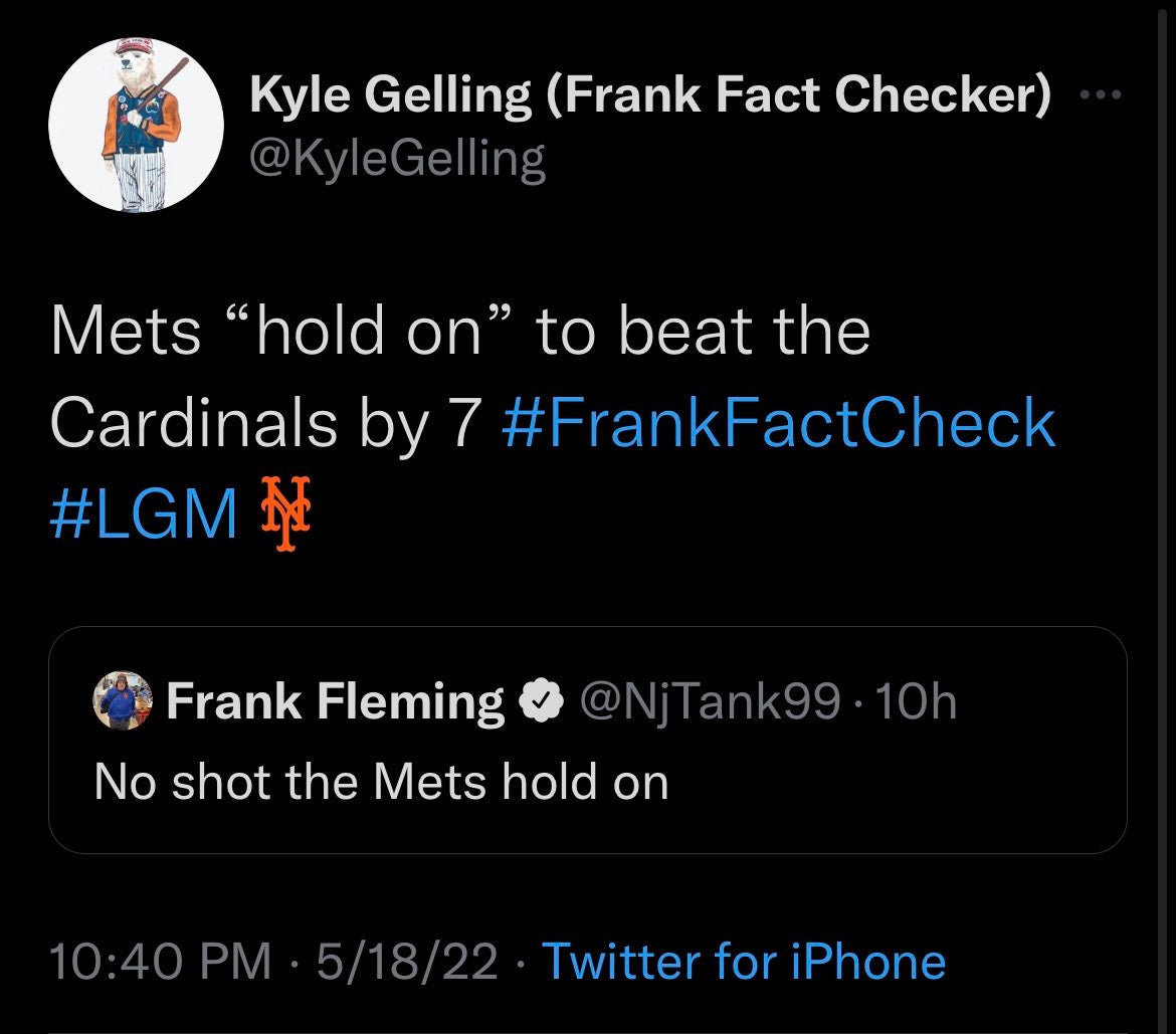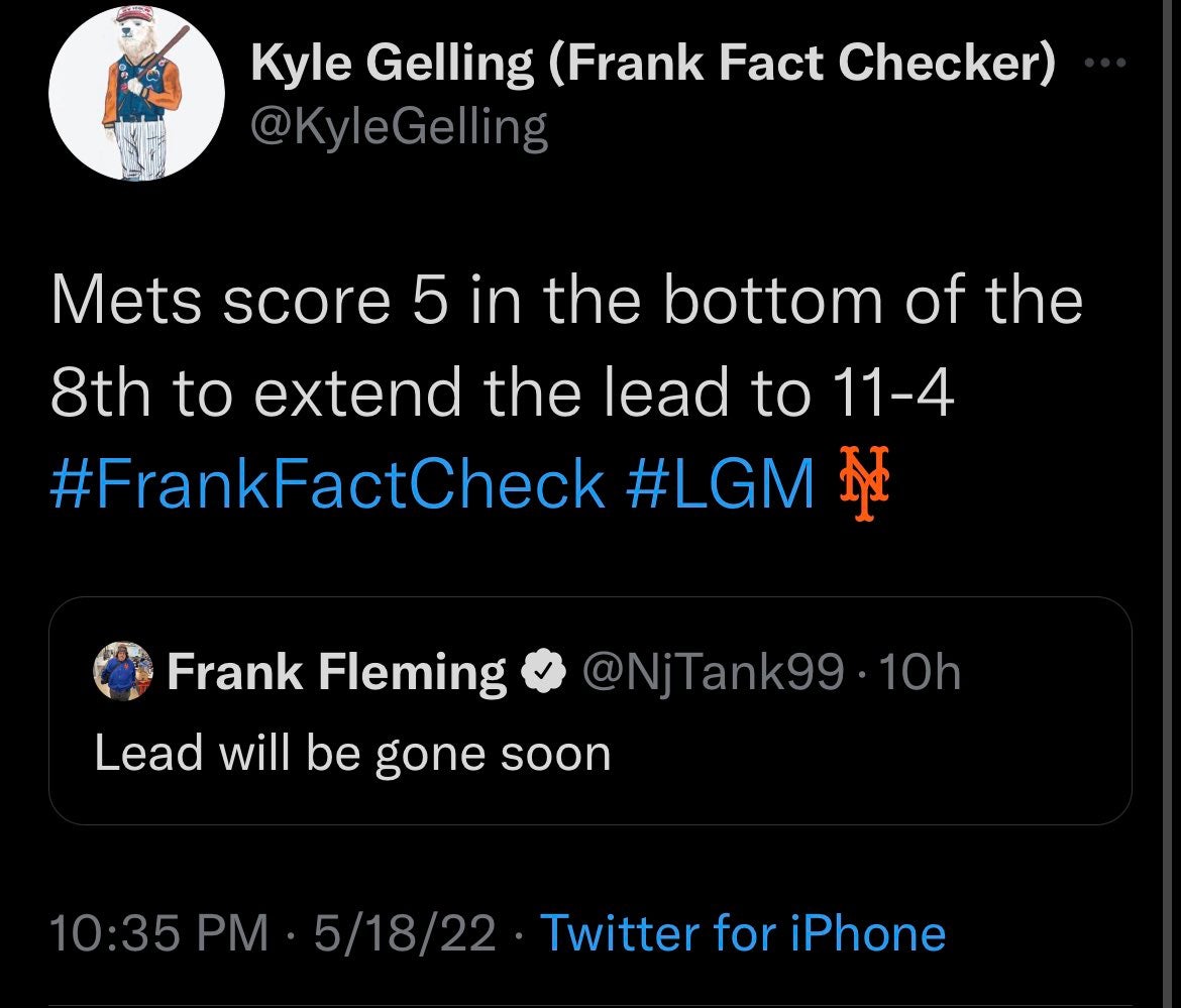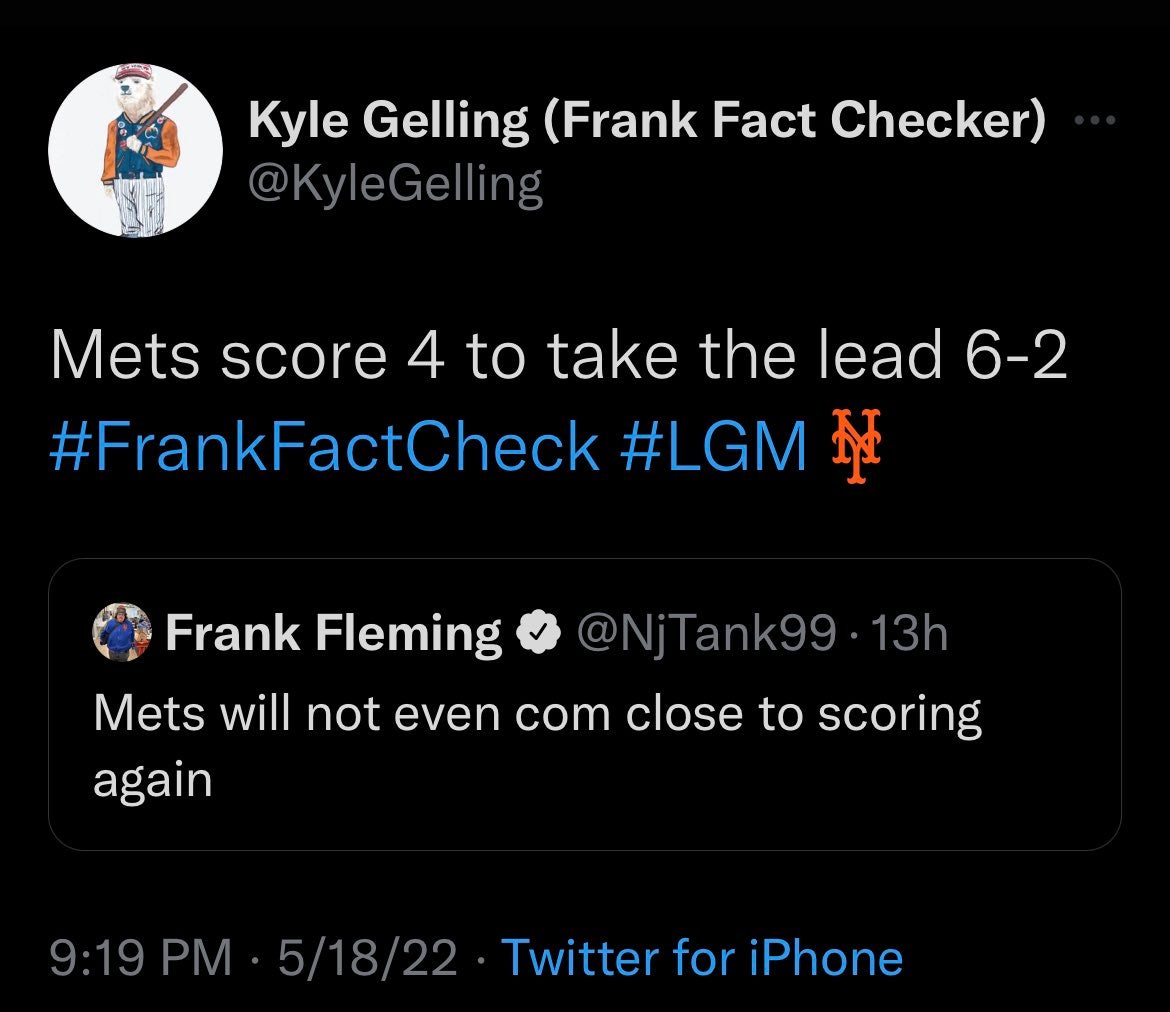 I need to go to bed because the kids are gonna be up in about 5 hours, so if the Mets can stop hitting bombs for a little bit so Gary's voice doesn't wake me up for the rest of the night, I'd truly appreciate it. Even though I love watching this loser take L's.