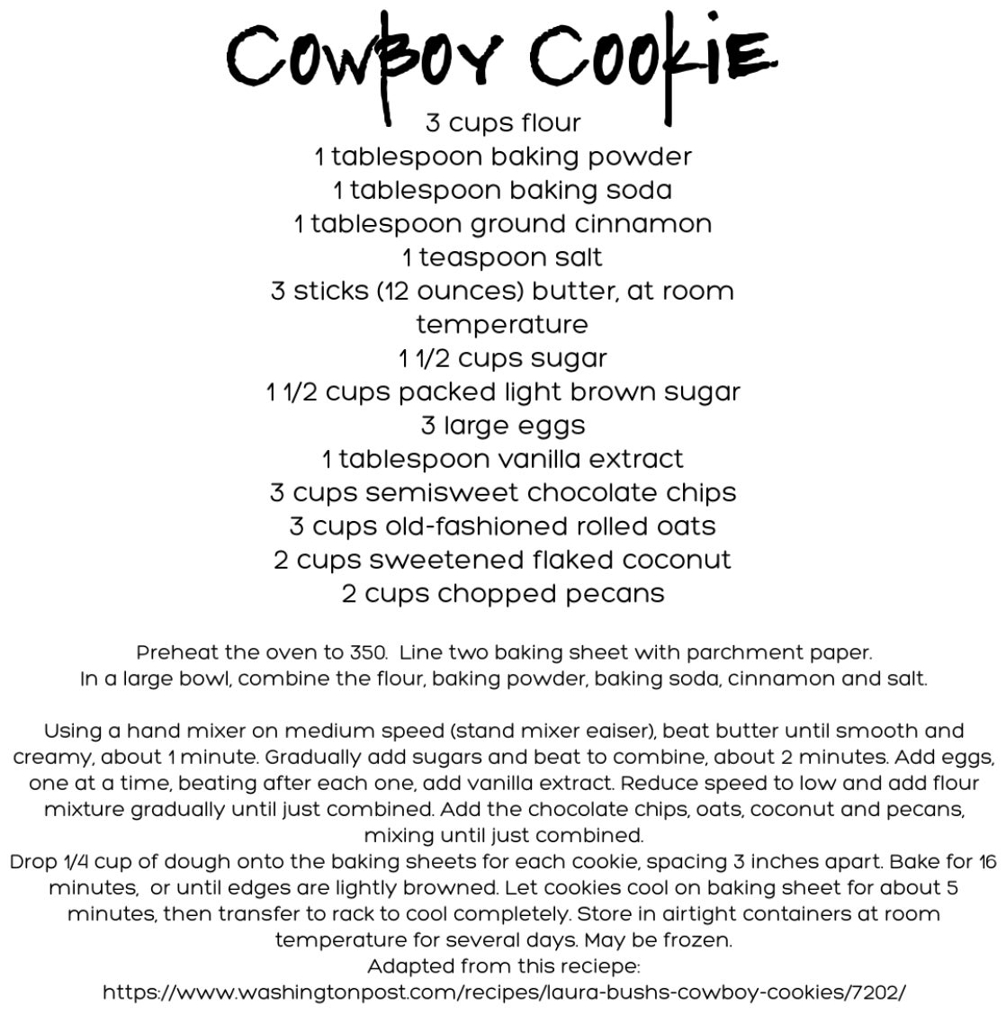 I used this recipe: https://shesnotcookin.com/laura-bushs-cowboy-cookies/. DO NOT let politics play into this yummy cookie recipe, seriously.