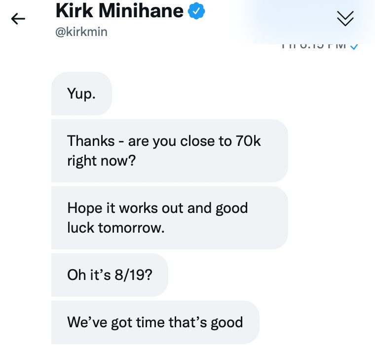 Kirk thought the fight was this weekend. The good news for me, we have time to hit the 70k