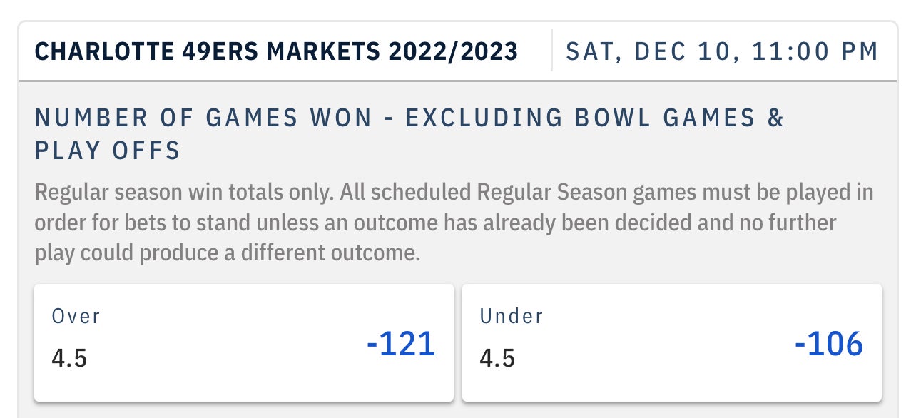 Charlotte 49ers OVER 4.5 Wins -121