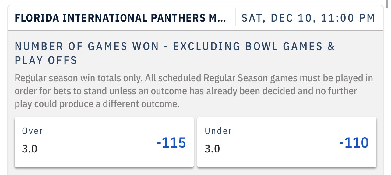 Florida International Panthers UNDER 3 Wins -110