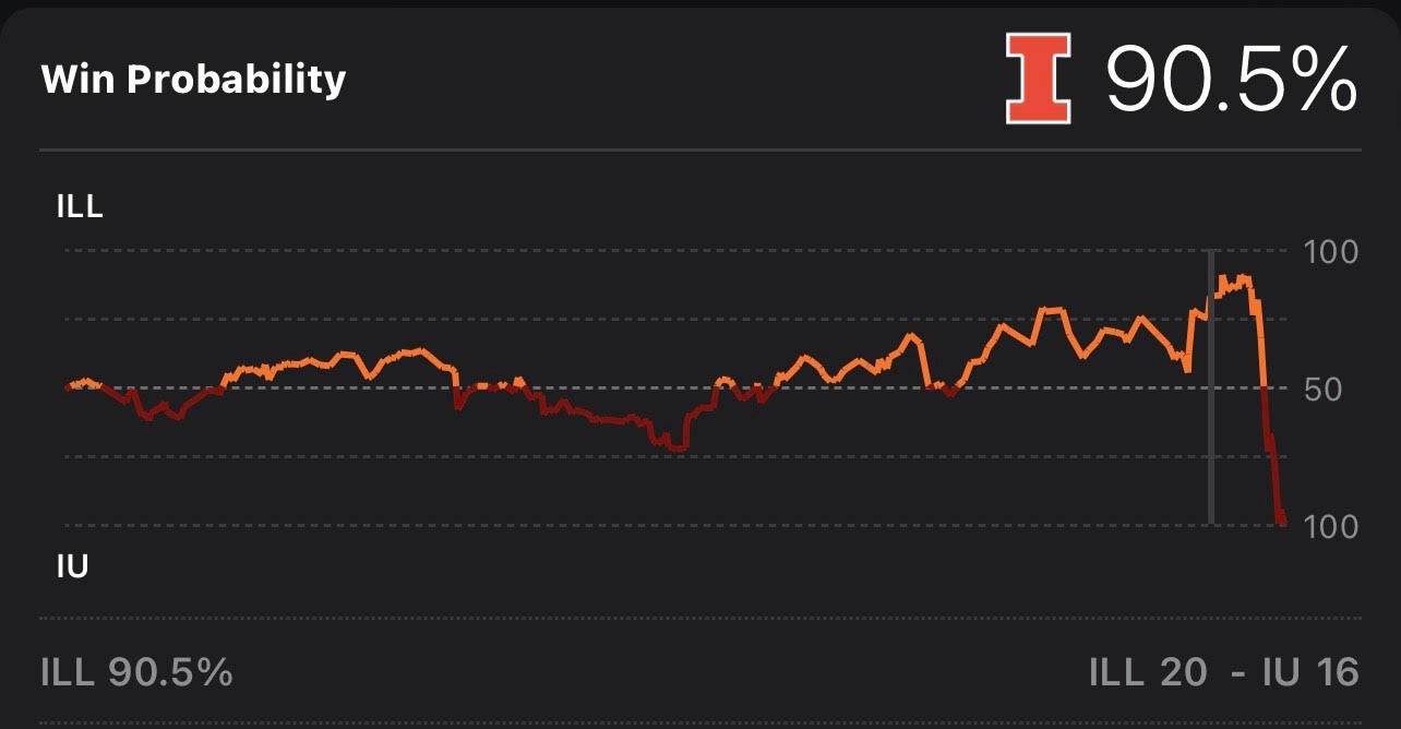 Illinois kicked a field goal to go up 20-16 with 2:16 left in the 4th quarter. Indiana's offense had scored one touchdown all night prior to this, so I was pretty sure that they weren't going to just march down the field and win the game.