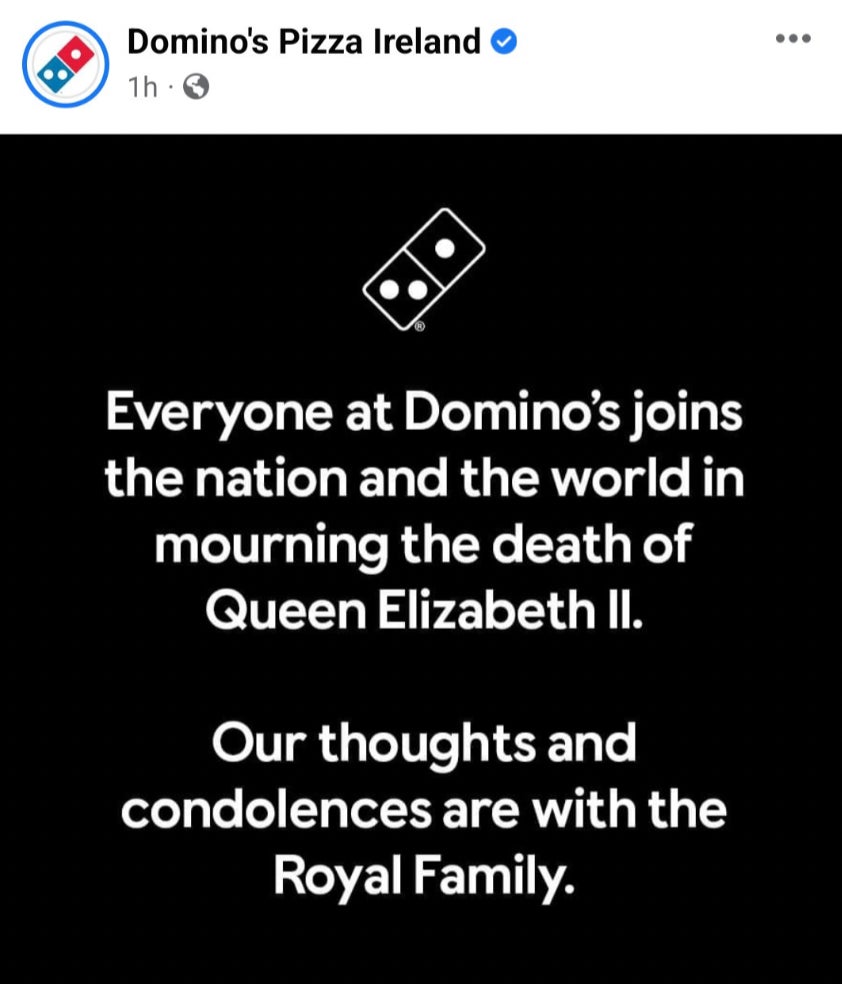 It's now deleted, possibly for being too cheesy (ha ha!), but the Dominoes UK domino went all-black in mourning: