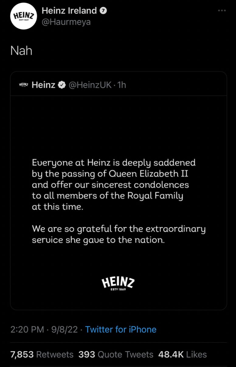 Condiment condolences from Heinz UK, which was quickly ratio'ed by a fake Heinz Ireland account (unlike those cowards at Dominoes Ireland):