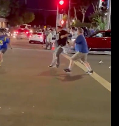 Frankly, I love it. Give me random NFL players showing up at every street fight between fans and breaking down what's going on. A bunch of swing and misses. Cam Akers jersey guy not being remotely dazed after getting hit. It's the perfect fan fight. I can only imagine what started the fight. Probably a scoreboard vs ringz discussion if I had to guess. It's always something stupid like that.