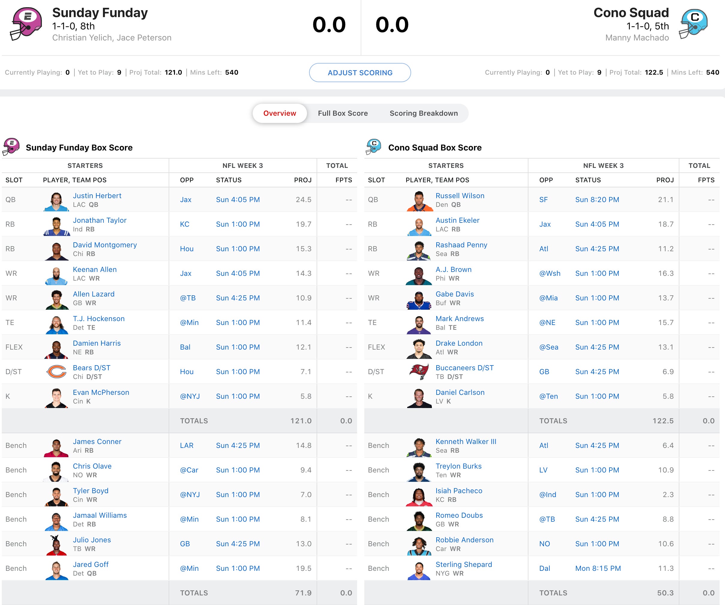 Don't look now, but the squad I wanted to give an incomplete to at Draft time because of all their unknowns managed by Manny Machado could be a juggernaught. If Russell Wilson can get it together, he'll have a good QB, top 5 caliber RB, and a monster WR unit with A.J. Brown, Gabe Davis, and Drake London. Romeo Doubs will get his shot to break out today with Sammy Watkins now on IR. He's my team to watch the rest of the way. Sunday Funday is in a tough spot with Justin Herbert's injury and with his game not til 4:05pm, Jared Goff as a backup isn't ideal. He'll likely move Herbert to IR and fill the roster spot Marcus Mariota, Trevor Lawrence, or Daniel Jones. All of which aren't very inspiring. The status of Herbert will definitely affect Keenan Allen, but I can see a huge game coming from Jonathan Taylor. The Colts got their brains beaten in last week and I expect a big time commitment to the run vs. KC. But will it be enough?