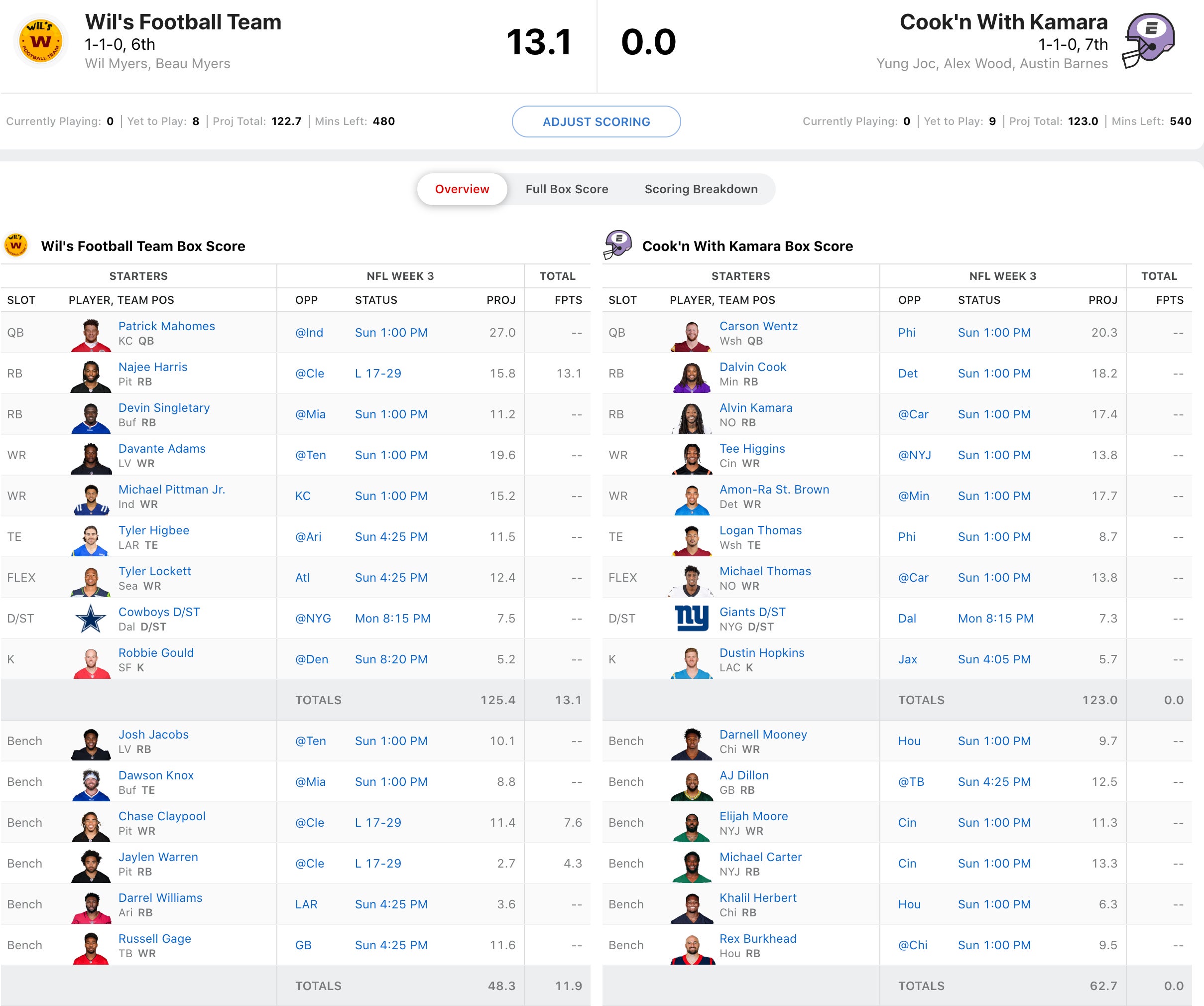 This game is essentially a dead heat between Wil Myers and Joc Pederson and a lot of it will come down to how well Carson Wentz plays in his first game vs. the Eagles since being dealt from them. Amon-Ra St. Brown is cooking, but Cook'n With Kamara almost has too much talent at some positions like RB and not enough at QB and TE. The FLEX spot is a weekly tough decision and this week they're sitting AJ Dillion. I do like the matchups on Will Myers team better, with Devin Singletary going back home to Miami, Davante Adams coming off a tough game, Michael Pittman Jr. was out last week and Tyler Lockett in what could be a sneaky high scoring game in the Pacific Northwest. Will changing Kickers (Mason Crosby => Dustin Hopkins) work out for them or is that too dangerous of a game?