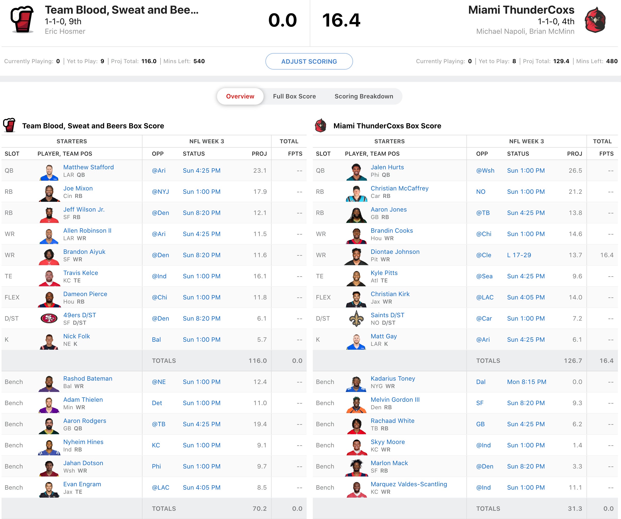Eric Hosmer is reeling, and another guy to swap Kickers this week (Jake Elliott => Nick Folk). Outside of QB1, RB1, and TE1, his roster is void playmakers with very high ceilings. He may be best served trying to deal Aaron Rodgers or Stafford to improve in other areas, but he also needs Travis Kelce to be a top 2 TE every week to make up for the rest of his roster, which has potential, but is still growing. Mike Napoli's squad put on a show last week led by Jalen Hurts and Aaron Jones, but he'll need more consistent production out of Kyle Pitts to justify his Draft spot. But he got a nice performance on Thursday Night Football from Diontae Johnson who outdid his projection by 2.7 points.
