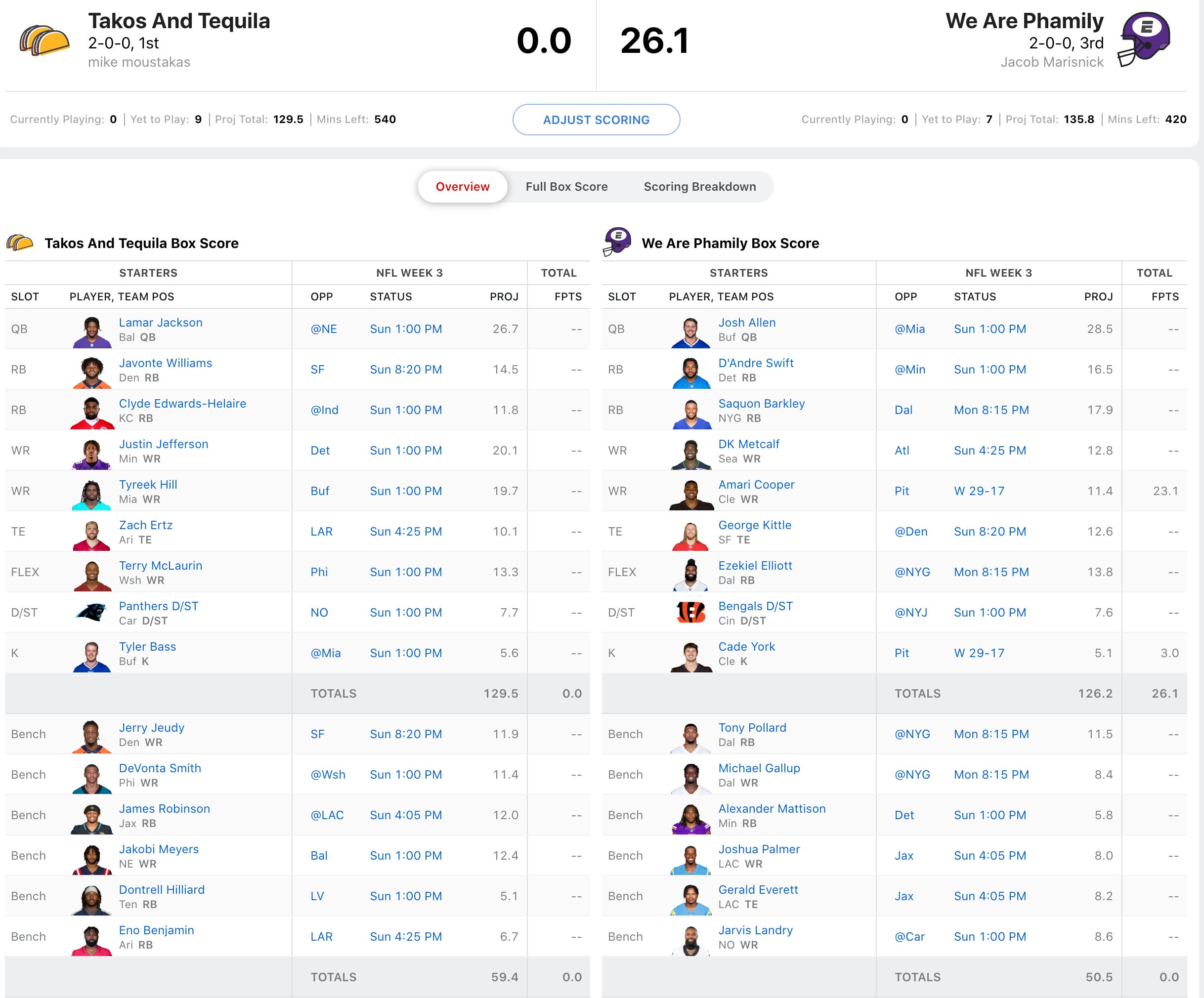 Mike Moustakas' team is an absolute wagon having scored 163 points in each of the first two weeks. His projection is quite a bit under that, but I wouldn't ever count his squad out. Although they do have a tough matchup this week with Jake Marisnick's squad that had Amari Cooper more than double his projection on Thursday Night. He'll also get his TE back in George Kittle this week. But this matchup will likely come down to Monday Night as Marisnick has both Saquon Barkley and Zeke Elliott in his starting lineup. Moose will ned big games from Justin Jefferson, who has torched the Lions, and Tyreek Hill who could see himself in a shootout vs. Buffalo. I will say that starting the Panthers D/ST is a bold choice, but I respect trying to get points for the inevitable Jameis Winston turnovers.