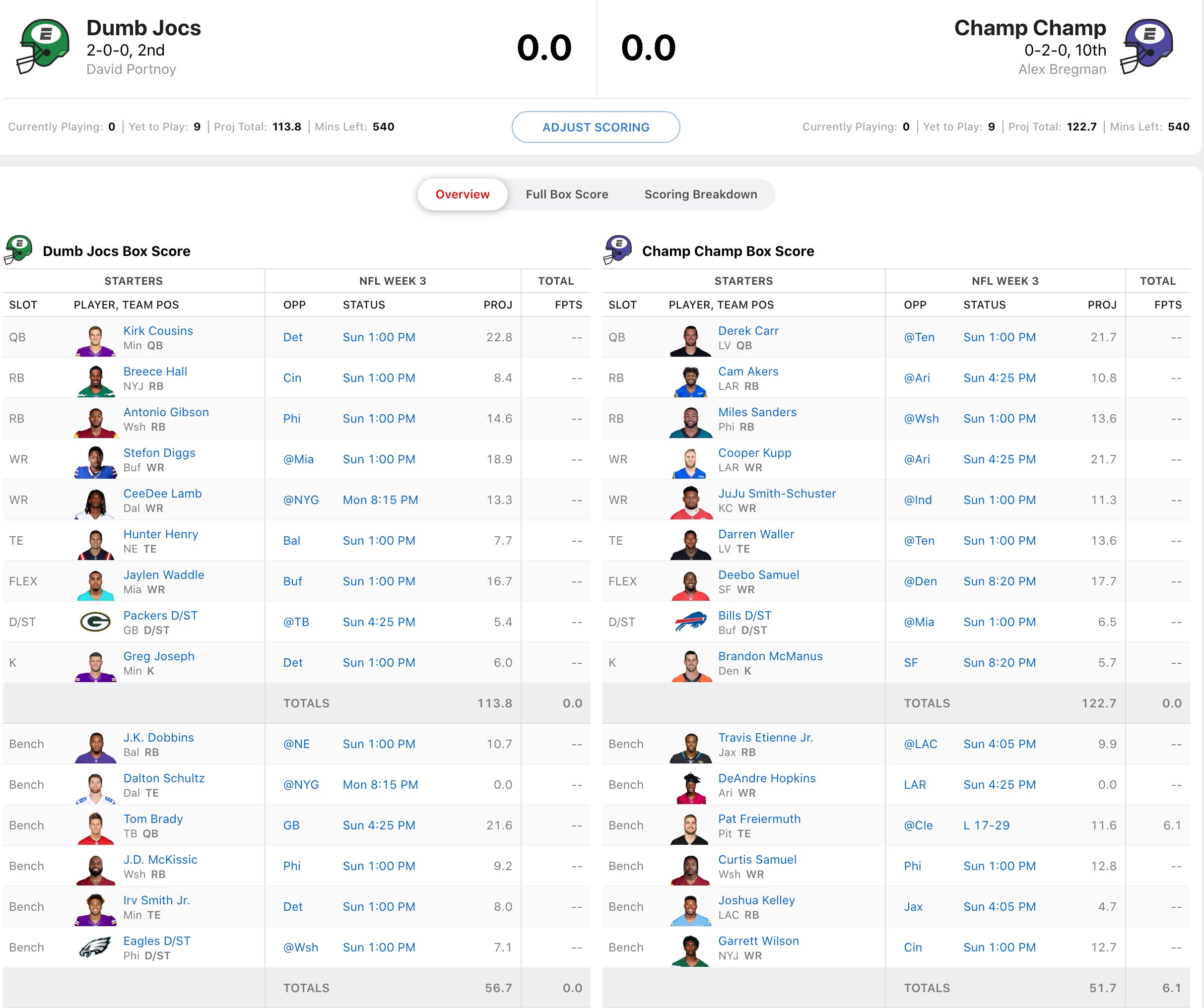 This is a pivotal game. Dave Portnoy has a chance to take 1st place in the league if this happens coupled with a Moustakas L. He'd also potentially put a stake in the heart of the defending champ, Alex Bregman. But Bregman's team has some pretty favorable matchups and is a 10 point favorite. His squad will likely live and die with the performance of Derek Carr and more specifically Darren Waller. But his WRs are terrific with Cooper Kupp, Curtis Samuel, and Deebo Samuel although Bregman is making the call to go with Juju Smith-Schuster over Curtis Samuel in a move that could make or break his week. The Bills D/ST could end up biting Bregman here in a potential shootout vs. the Dolphins and he did not make a move, choosing to keep a backup TE on his roster instead. Portnoy meanwhile has gotten stellar play out of his WRs, especially Stefon Diggs and Jaylen Waddle. Once Dak Prescott gets back, CeeDee Lamb should be jettisoned up the rankings and this squad will be a very tough out. Dave has an interesting decision this week at RB with JK Dobbins looking like a go vs. a New England team that Baltimore has fared well against historically. He did choose to go with his guy Hunter Henry at TE over Irv Smith Jr. in what could be a pivotal decision. Also at D/ST, does he go with the Packers, who should hold the Bucs to a lower point total, or the Eagles going against the turnover-prone Carson Wentz? This has a shot to be another Monday Night tightrope walk for Dave with Lamb closing the week out in under the lights on MNF.