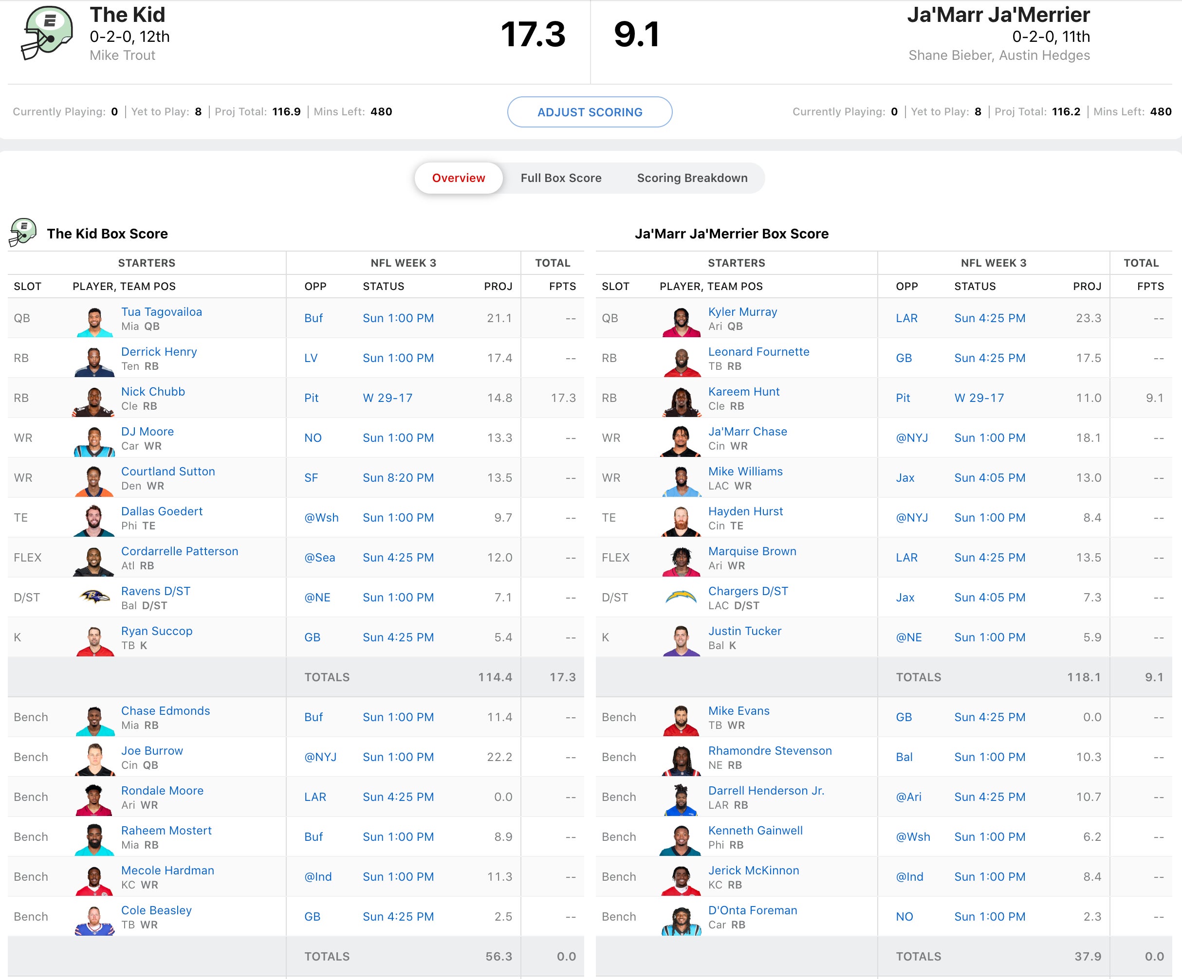 A battle of the two last place teams with both squads NEEDING a W. Mike Trout's team actually has a bunch of great matchups and already had their Browns RB outperform his projection on Thursday Night. The Cleveland Guardians duo of Shane Bieber and Austin Hedges weren't quite as lucky as Kareem Hunt fell 1.9 points below his projection. I actually love Trout's chances this week as Derrick Henry has a great matchup vs. the Raiders in a game I could actually see Tennessee winning. Burrow threw 3 TDs vs. the Jets last year and DJ Moore is waiting to go off. The Ravens D/ST gets a struggling Mac Jones too. Ja'Marr Ja'Merrier will need a big game from their stack of Kyler Murray and Hollywood Brown to pull this one out, which is certainly possible against a Rams team that has given up their fair share of points this season.