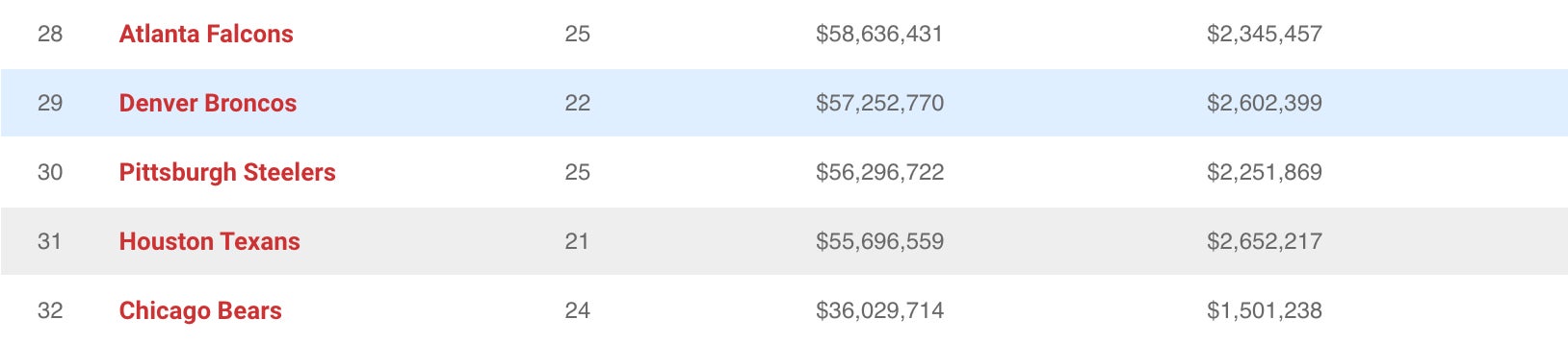 That is astounding. I didn't realize it was that bad. That is an indication of a plan. What the plan is I don't know. That is for Poles to say, but you don't spend this little by accident. And this is with Pringle and Whitehair factored in. Both of them are on IR so it's actually closer to $20M total. It is a god damn MIRACLE that they have been in basically every game the entire year and found ways to lose them.