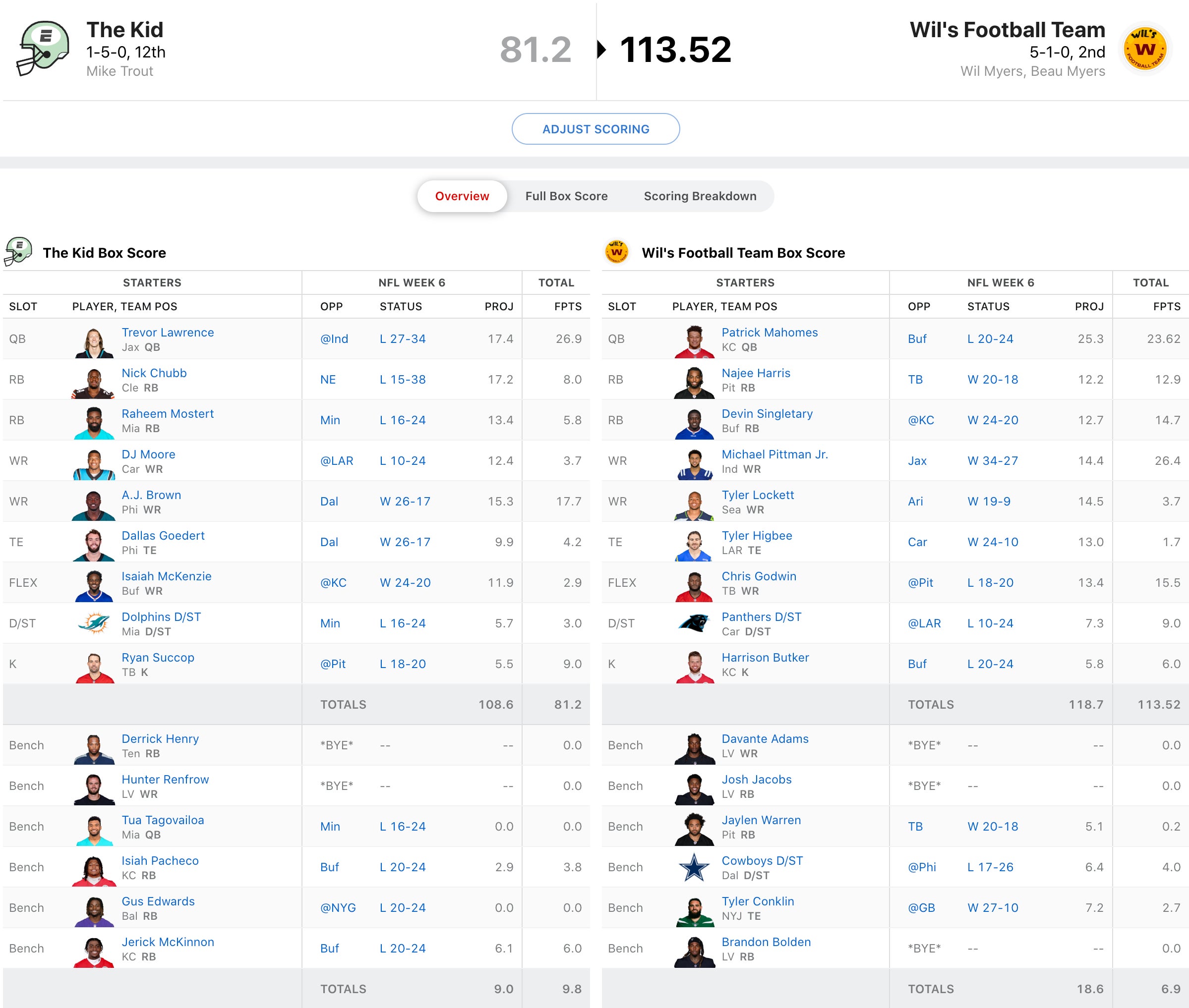 Trout had struggled. to get his QB1 optimized all year, but it worked this past week as he only had one healthy guy who did perform. However, Derrick Henry had a bye and Nick Chubb underperformed his projection by 9.6 points. DJ Moore has been a fantasy dud this season and this team is in need of a spark. Wil's team got a huge game out of Michael Pittman Jr. and despite poor showings from Tyler Lockett and Tyler Higbee, they rolled to a 32 point win.