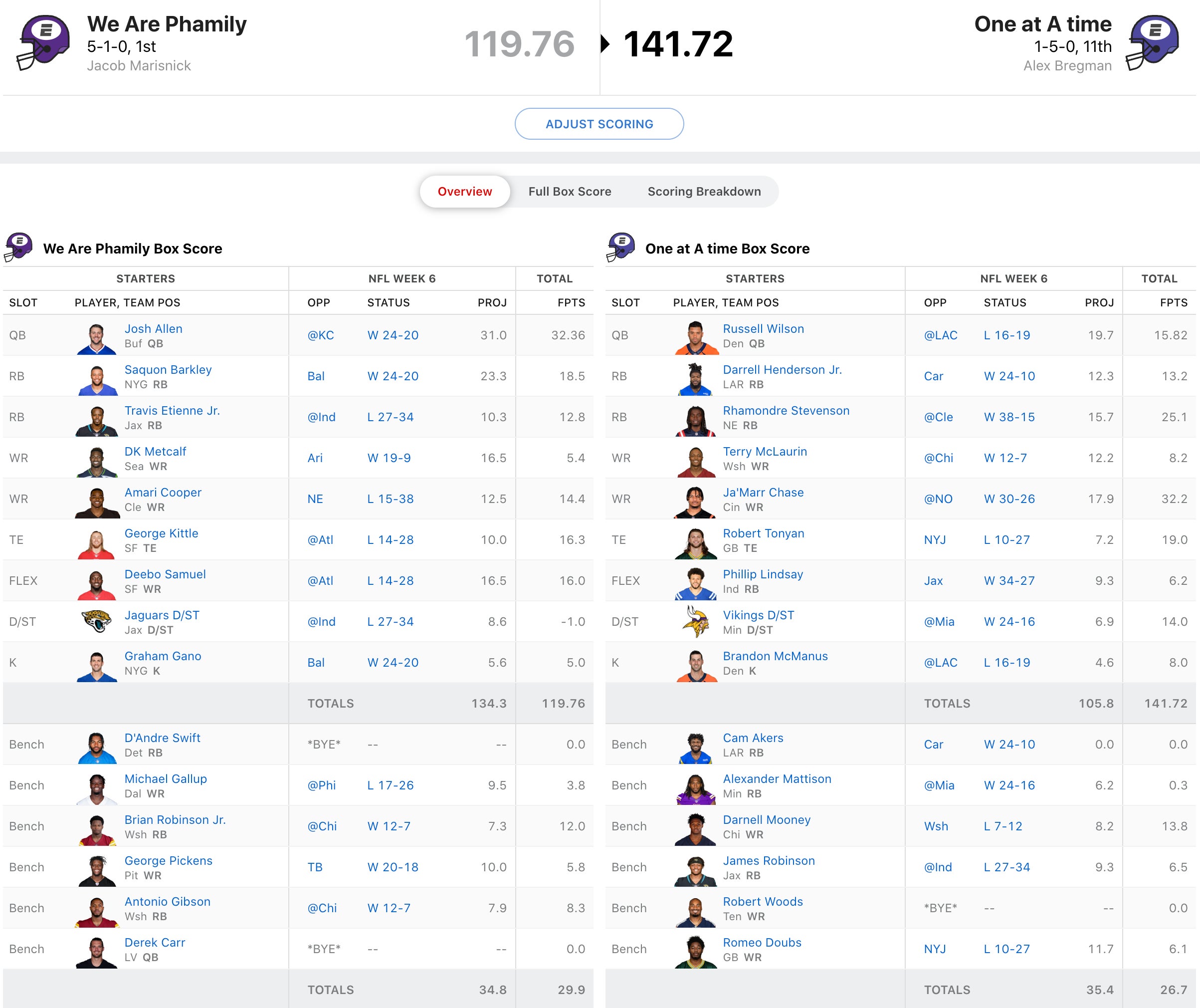 Marisnick got strong play from most of his starters outside of Saquon Barkley and DK Metcalf. His Defense also let him down, but Bregman, who has renamed his team One at A time got a mega performance out of Ja'Marr Chase who went home to New Orleans this past weekend, smashing his projection by 14.3 points. Rhamondre Stevenson also looked like a savvy swap as he outdid his projection by 9.4 points. At TE, Robert Tonyan's 10 catch 90 yard game was a big boost and despite his continued ineptitude at the QB position, he got his first W. The Astros are hot!