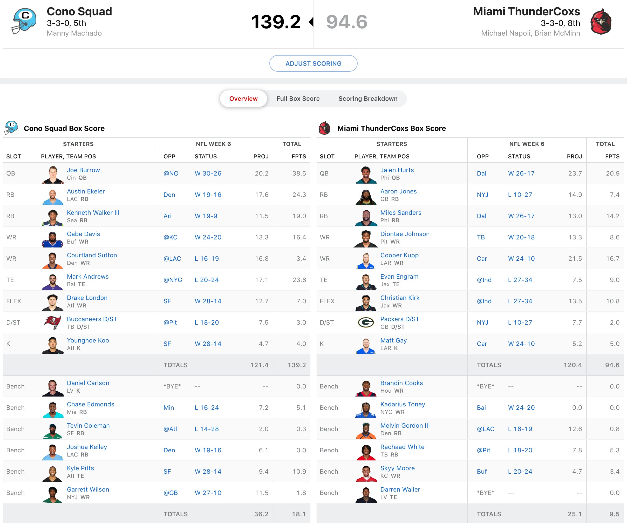 Another good use case for going TE early as Mark Andrews outscored the team's opposing TE by 14.6. That type of cushion is ideal, but he didn't even need it. Joe Burrow was QB1 on the week back in New Orleans. Austin Ekeler is also starting to live up to his draft status with 24.3 points. Kenneth Walker III also seems to be a hidden gem as he's shining with Rashaad Penny sidelined. Napoli is in trouble with the Eagles and Rams on a bye. None of those guys did enough to help him get the W and he only had two players over projection which is always a losing formula.