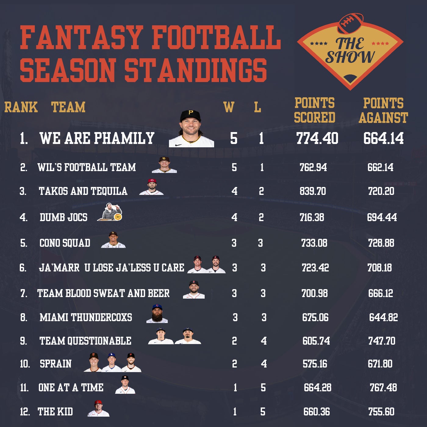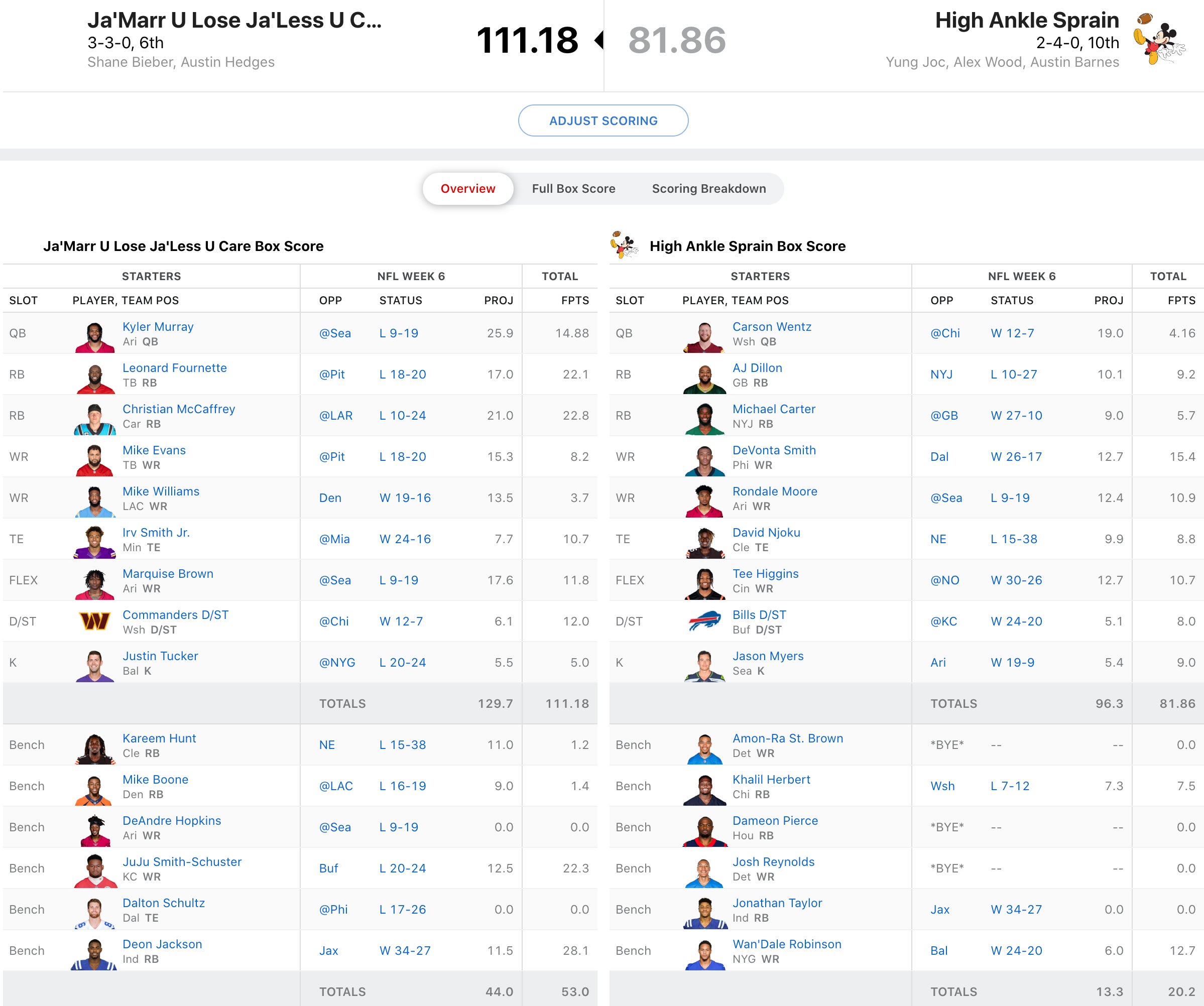 A star studded backfield with newly acquired Christian McCaffrey and Leonard Fourtnette are a big reason as they put up 44.9 combined points this week. That masked the stinker from the Mike & Mike crew of Evans and Williams who missed their projections by a combined 16.9 points. They'll get DeAndre Hopkins back from suspension beginning tomorrow night which will only really steady the ship after Hollywood Brown's injury. The Joc Pederson, Alex Wood, & Austin Barnes trio who have renamed their squad High Ankle Sprain had a tough week with Amon-Ra St. Brown and Dameon Pierce both on a bye. Then had to start the week with a Carson Wentz dud, so they never really got off the ground in this one.