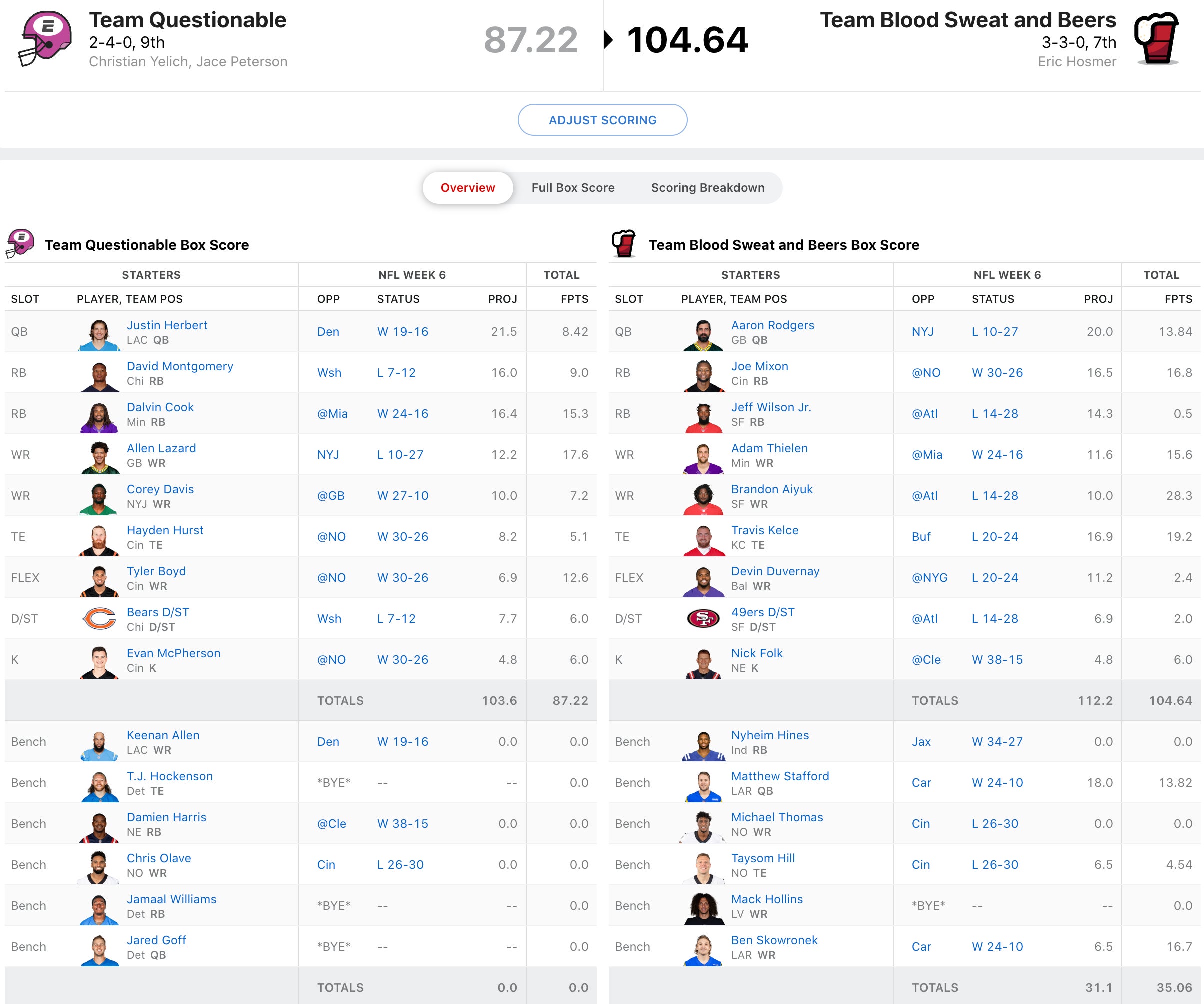 He just continues to get good performances out of rotational guys, this week the star being Brandon Aiyuk. Travis Kelce is giving him such a leg up at the TE spot (won this week by 14.1 points) that he has the luxury of losing some other spots. Jeff Wilson Jr. had a dreadful game along with Devin Duvernay, but he overcame it, mainly due to Justin Herbert's egg he laid on Monday Night and David Montgomery. Herbert missed his projection by 13.08 points and Monty fell short by 7.0 points.