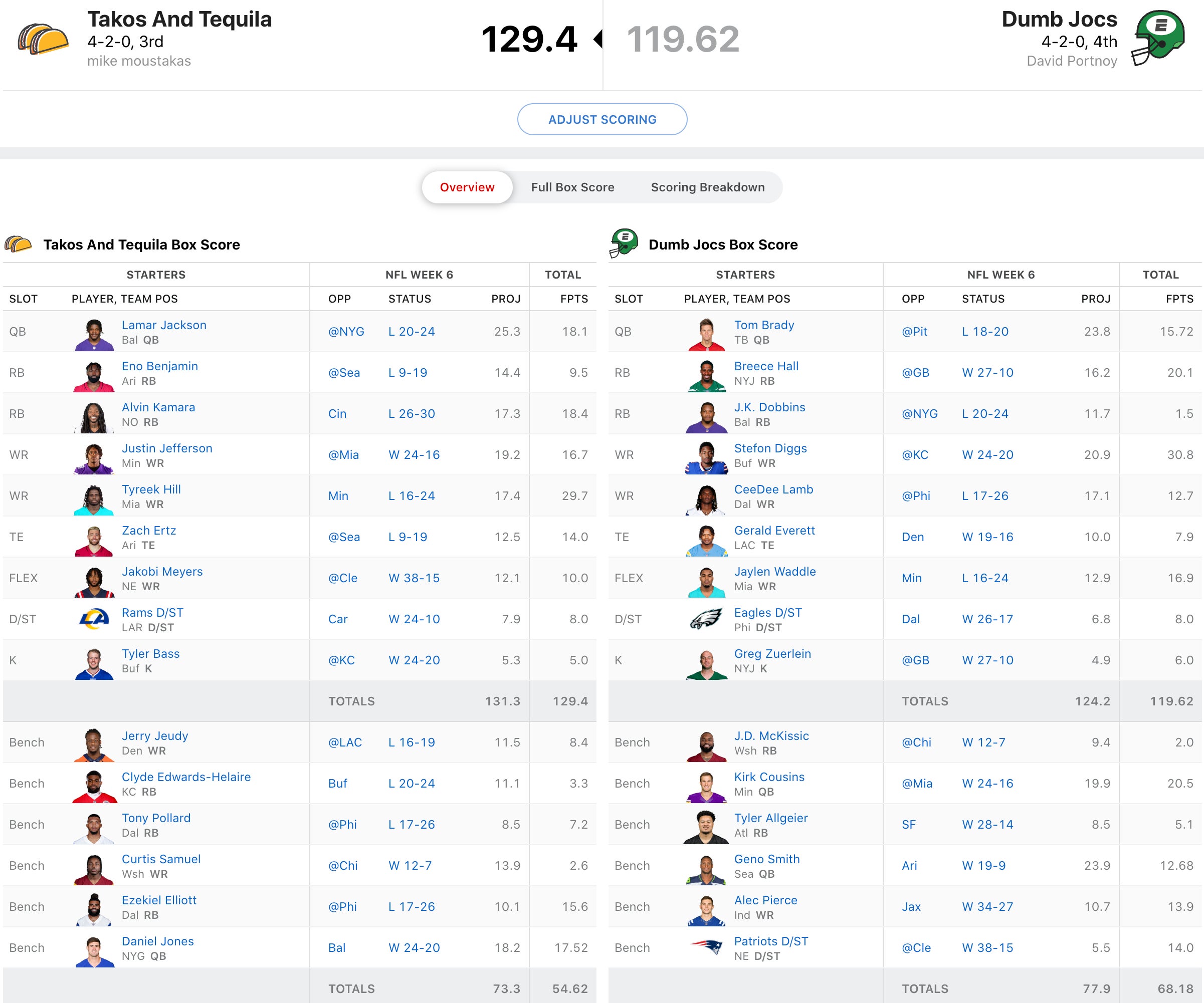 Moose leads the league in points scored and showed why here, nearly matching his projection despite off games from Lamar Jackson and his RB2 last week, Eno Benjamin. Dave fell by under 10 points with JK Dobbins being the main culprit who got hurt and missed his projection by 10.2 points. Tom Brady also struggled again and from what I hear is firmly on the hot seat with Portnoy.