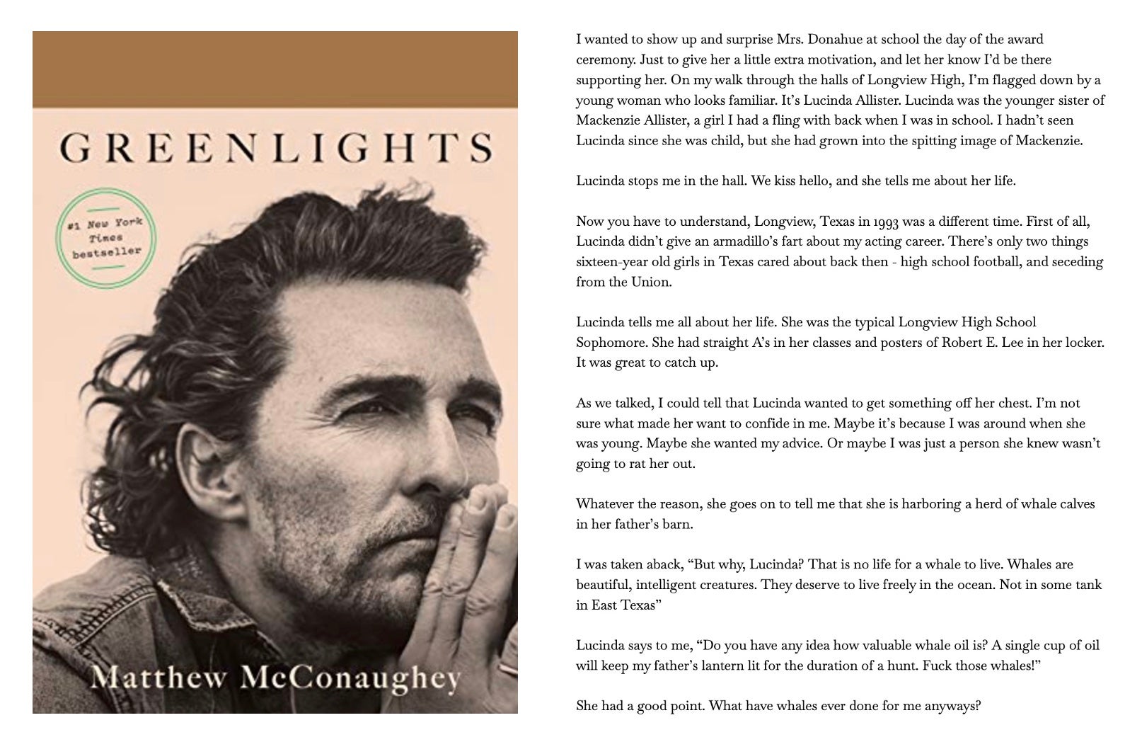 I have recently started reading books again. I feel as if my vocabulary is not where it should be. I've heard that reading books is good for things like that. But if I'm going to read a book, then I'm at least going to get some content out of it. To wrap up my Daily Truth's, I will post a daily excerpt from a popular book that I am currently reading (I'm on a 1 book per day pace). This first excerpt comes from Matthew McConaughey's Autobiography, Greenlights.
