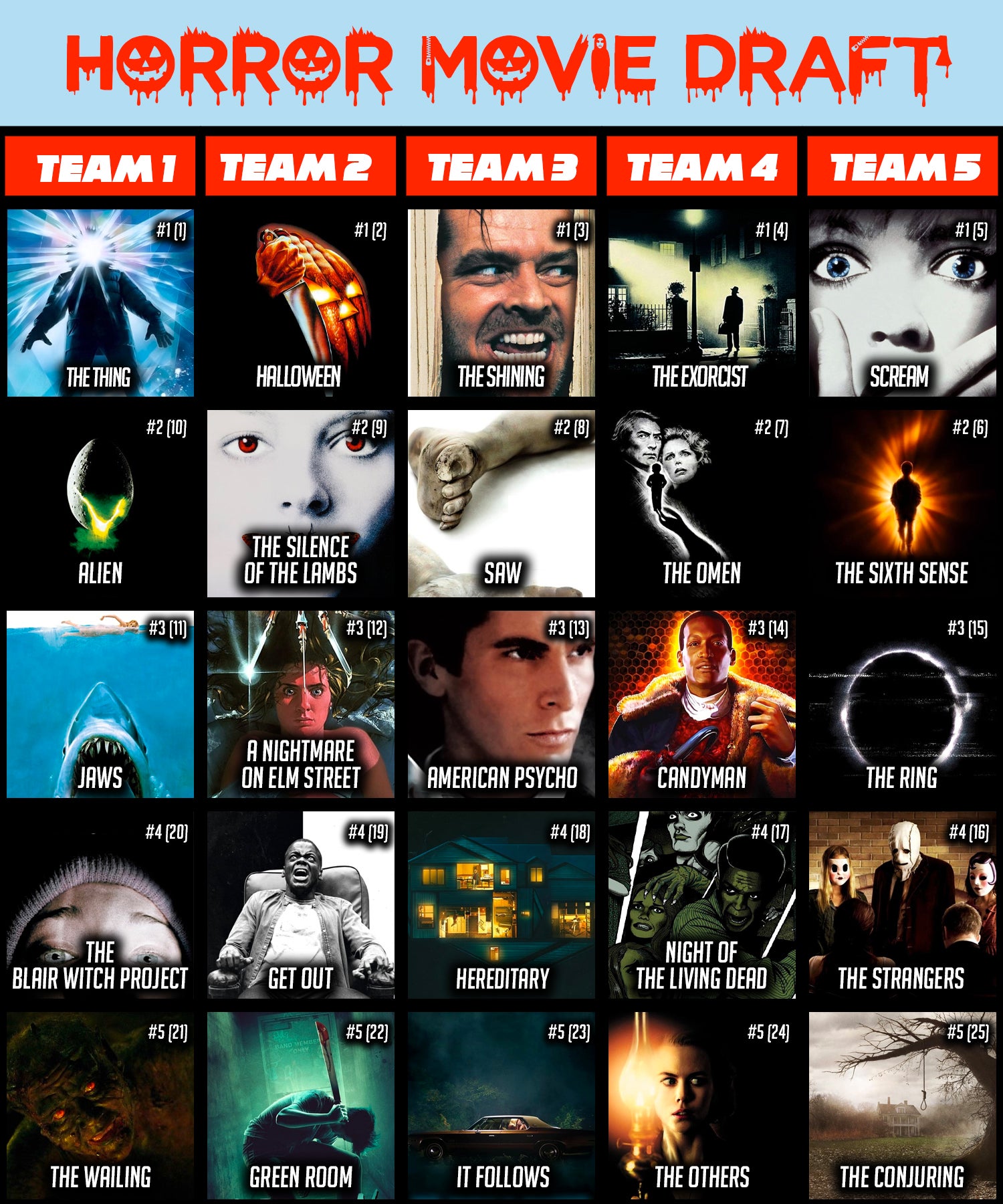 Halloween is an EXCELLENT pick at #2 overall. Should've been #1 in my opinion. This drafter also did an outstanding job pointing out that the movie basically spawned a very universes. Silence of the Lambs is a great 2nd Rounder and was a 1st in my book. Nightmare on Elm Street is also a classic, but I love the modern pick of Get Out, which is very good value in Round 4. I haven't seen Green Room, but another Round 5 selection to a star studded draft.