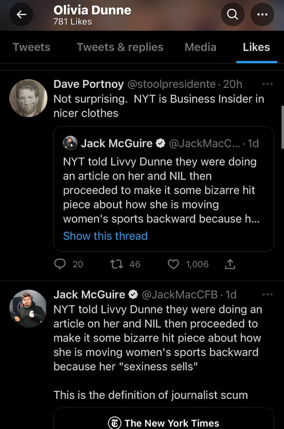 We're just a day removed from the New York Times' attack against LSU gymnast Olivia Dunne. The Times called her out for the way she's built her brand and gotten to the point where she's pulling in $2 million from NIL sponsors. Stanford's women's basketball coach Tara VanDerveer called it a "step back" for women. It's all in my blog below which shows you people will truly get upset about anything these days.