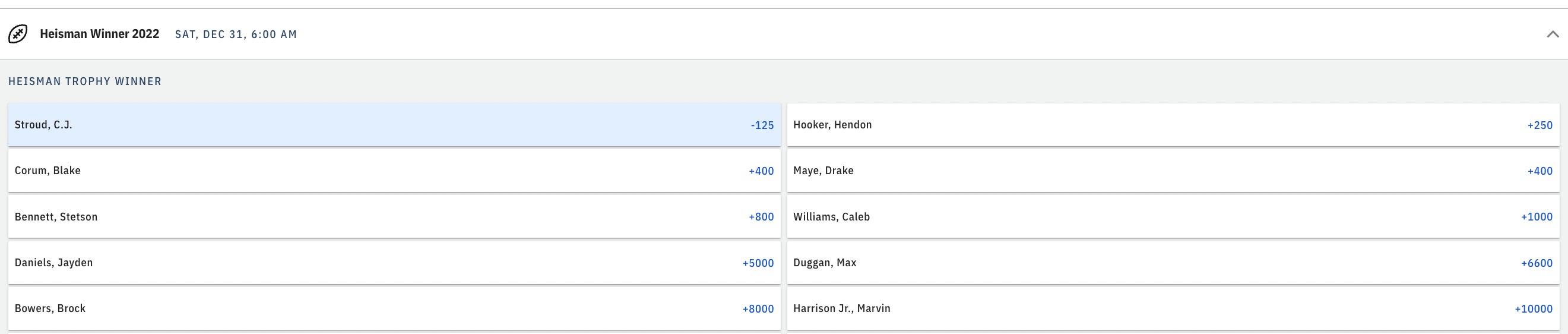 A- Like I said at this point Williams' stat line is on par with Stroud and Hooker, the two favorites to win the award. If he was way behind, it wouldn't even be worth a look. But the fact that at this point he's statistically having just as good a season as anyone in the country means there isn't a massive amount of "catching up" to do. He's par for the course. He doesn't have to go out of his mind and throw for 600 yards and 5 TD's a game to have a chance at this. He just has to keep doing what he's doing and his stat line will be right there with Stroud and Hooker.