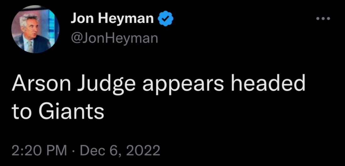 Not only did they get juked out by Correa and Scott Boras, there was also about 7 minutes where they thought they were getting "Arson Judge". What a tease for Giants fans this offseason. There was a time where they thought they had both Judge and Correa and now they have neither. The worst was they both were in writing! There was proof they were getting them! Even though Heyman screwed it up, they 100% thought Judge was a Giant.