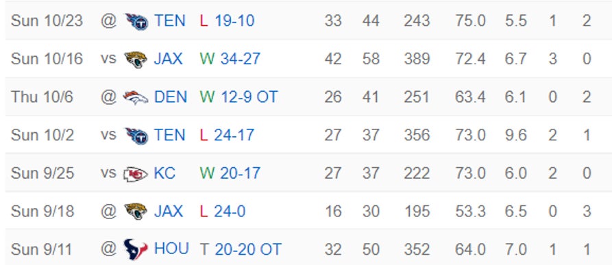 The Colts started out a respectable 3-2-1. But in hindsight we should have known that the Colts season was over after their Week 1 tie to the Houston Texans. You can't tie a team that is actively trying to lose and expect to turn things around. I don't have a great explanation for why I think this, but I genuinely feel like tying that game was worse than losing. If the Colts had lost to the Texans, we would have chalked it up as a bad week and moved on to the next. Nobody knows how to feel after a tie. The Colts tie just lingered awkwardly in the form of a 1 in the "tie column" on their record, serving as a constant reminder of that time the Colts were the same as the Houston Texans. Somehow that's even worse than getting blown out.