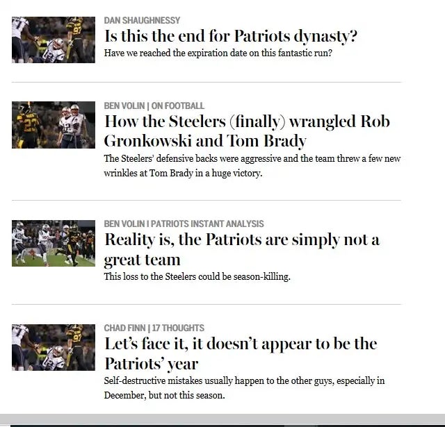 After all, I lived through 20 years of reading and hearing about the death of the Pats Dynasty. It came with the territory. Every playoff loss for them was Footballmaggeddon. The End of Days. Even if they slumped or lost a tough one in the regular season, they were in a death spiral they would never pull out of. I remind you again, this was the Boston Globe, about six weeks before they beat the Rams in Super Bowl LIII: