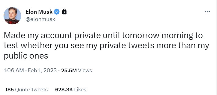 In case you're wondering "wtf is he talking about?"... Twitter users found a glitch in the matrix. Basically, if you set your account to private (only your followers see your posts) engagement moons. Rumors have been bubbling for a few days. Then, yesterday Elon went private to "troubleshoot" the issue. A real man of the people.