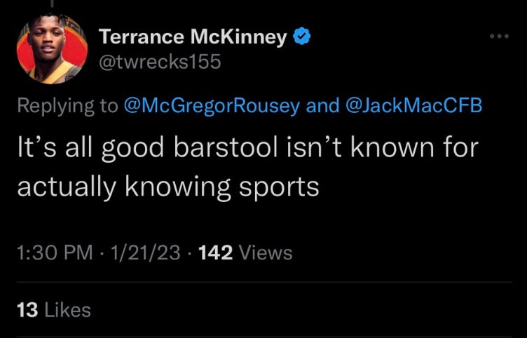 None of us felt the need to respond right away, because we hear shit like that every day - but we started playing up the McKinney vs Barstool narrative on the timeline throughout the day; and then when it came down to the bout itself, Bonfim wound up defeating McKinney via flying knee knockout.