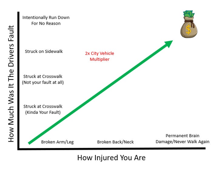 The problem is, if you want to get paid out, you're going to have to withstand potentially major injuries. Ex-Barstool Sports personality Liz Gonzales was once flattened by a bus in New York City. I believe she got paid, but I also believe she was in bad shape for a while. I don't mind being in bad shape for a little bit. Especially if I have a bag on the way. But getting hit by a bus is risky business. I would like to see a graph that depicts just how fucked up you have to be in order to get a certain amount of money. It would probably loosely look something like this.