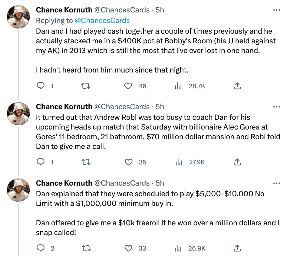 So back to Chance's story. Chance is an extremely good poker player. One of the best, to the point he was Bilzerian's coach for a $1 million heads up match vs a billionaire. Chance is also super reputable and well respected by everyone. He goes on...