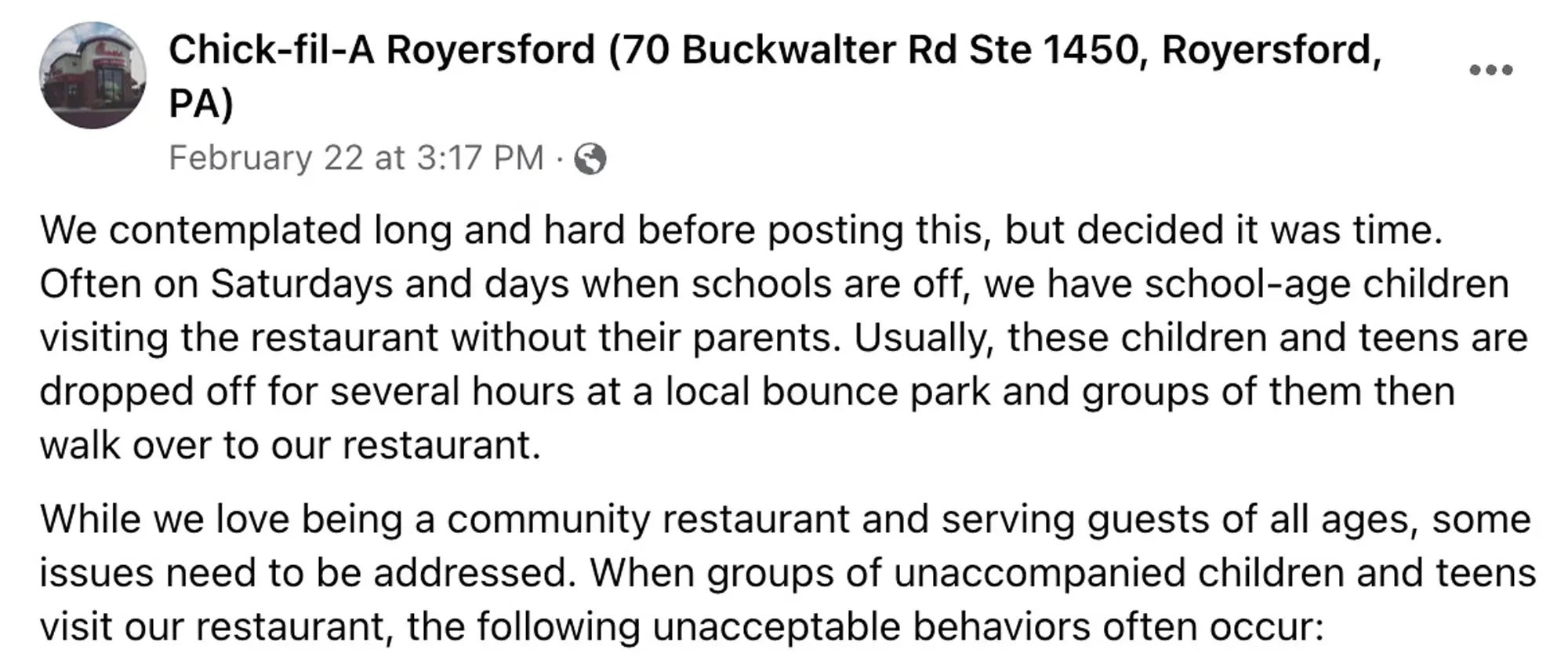 While it loves “being a community restaurant and serving guests of all ages,” the Chick-fil-A wrote on its Facebook page, “unacceptable behaviors” by groups of children wasn’t worth welcoming them anymore unless with mom, dad or another adult chaperon.