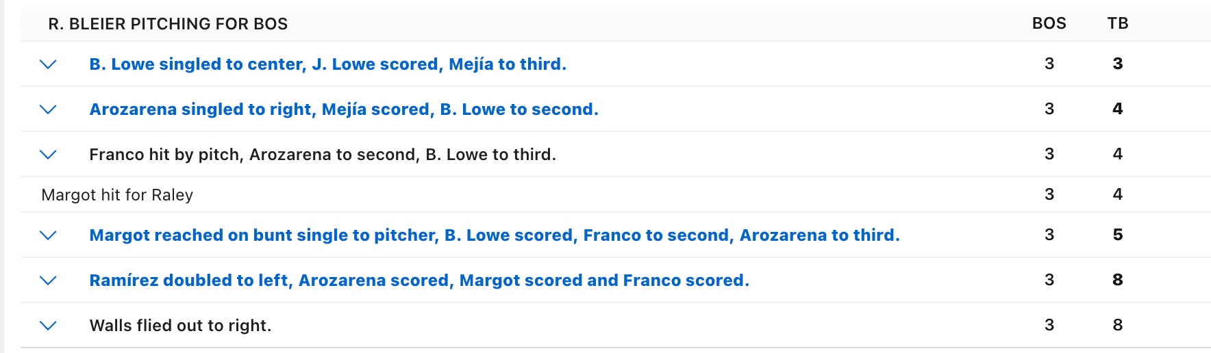 Side note: Cora absolutely fumbled this game away in the 5th. Two out, two on with the lead and Brandon Lowe at the plate. Lowe 0-5 vs. Corey Kluber with 5 strikeouts in his career, including 2ks in the game already. Cora yanked his starter for Richard Bleier who proceeded to give away the game. No telling if they escape this and go onto win, but there was no turning back here.