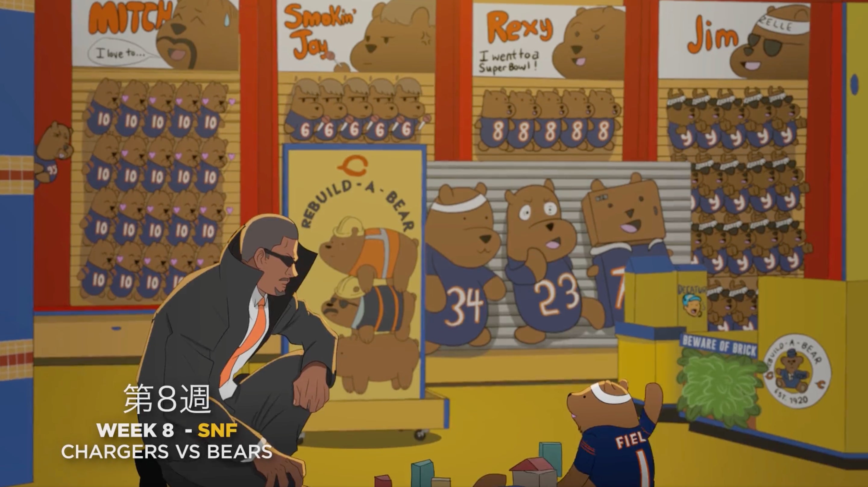 This one has A couple nice nuggets. Rebuild-a-bear, the reference to Mitch kissin' titties, the little nod to "brick by brick" on the desk. I can't tell who the bear peeking in from the left is but maybe a bear fan can spot more here.