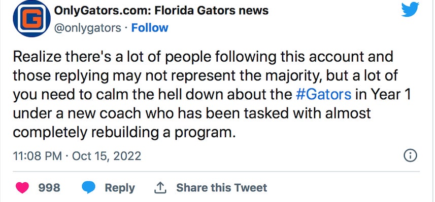 Probably the most knowledgeable Gator fan as well as sports guy on twitter who goes by the handle @tblack has come under fire for making very realistic statements about where we are as a team and fans often react in a argumentative way. I watched one of the greatest Florida gator players in the history of the program get harassed and bothered because of a highschool player that he happened to be coaching choose the Colorado state seminoles over of the university of Florida. WE ARE LOST!