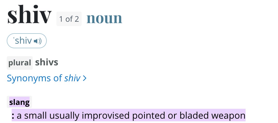 - What, you thought Shiv was short for Siobhan? HA! Those bitches Meriam and Webster knows what her name really means.