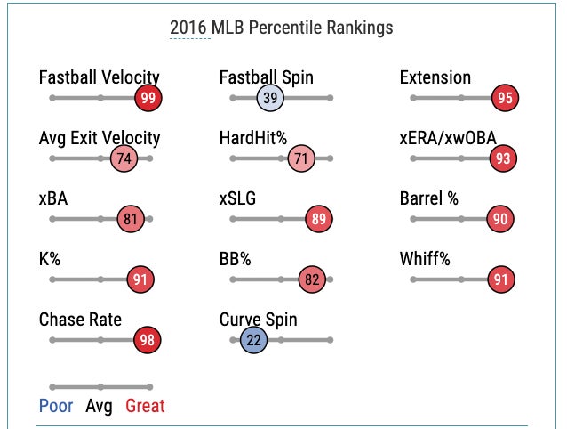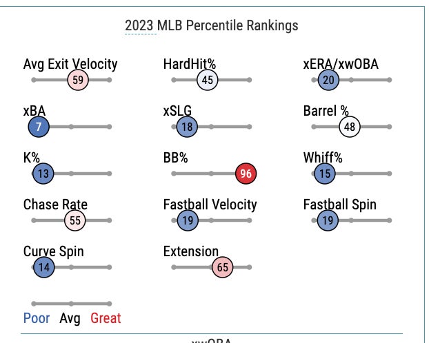 Through 11 starts so far he's posted a 6.54 ERA over 52.1 IP while only striking out just 35. Today was rock bottom as he was knocked around by the Washington Nationals to the tune of five runs over five innings including three homers. Just take a look at his baseball savant page compared to his prime back in 2016. No real need to understand what everything means, just know red is great and blue is bad.