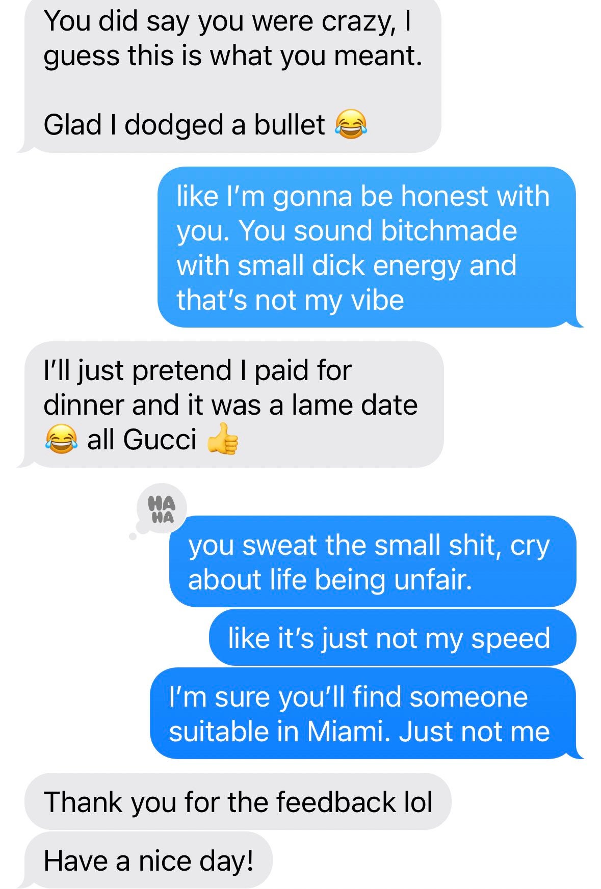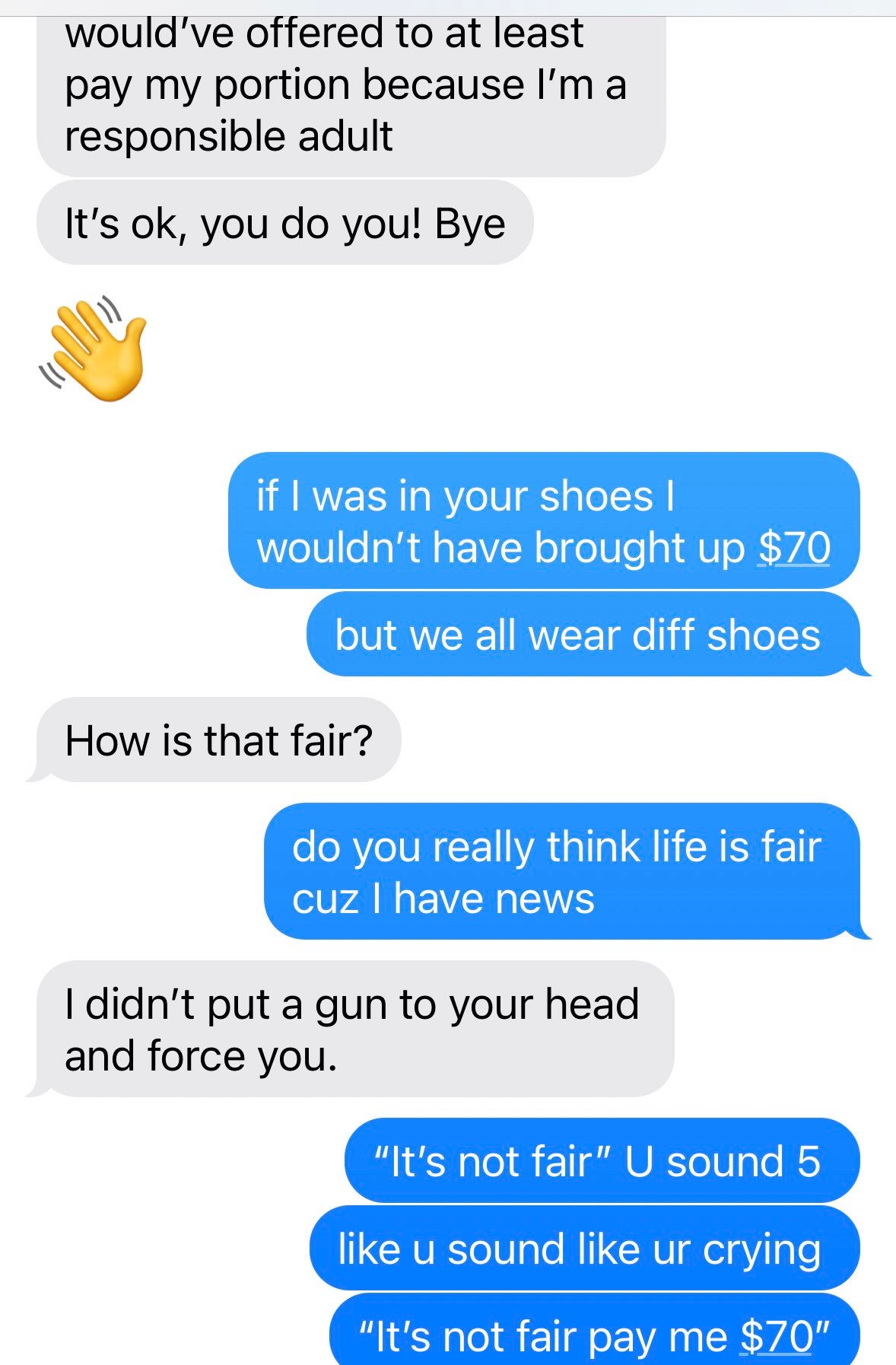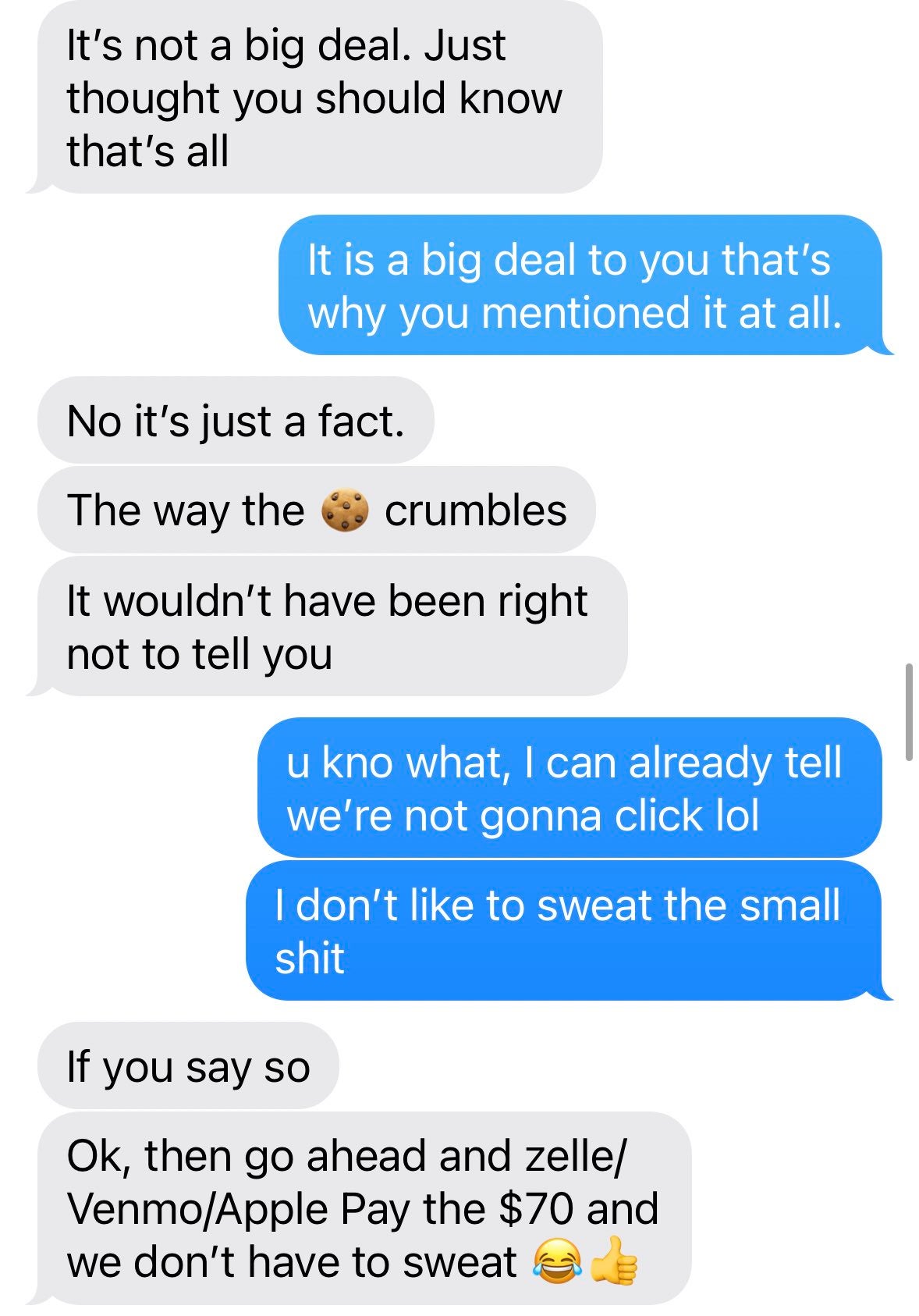 I will say off the top that this guy doesn't seem like he'd be my favorite person in the world, but he pales in comparison to this gal. He seems kinda petty and uses way too many emojis, but she's obviously on another level in terms of ridiculous behavior. If there's any positive to take away from this, it's that $70 to not have to spend a couple hours with her seems like a small price to pay, honestly. I'd guess he'd pay double that knowing what he knows now.