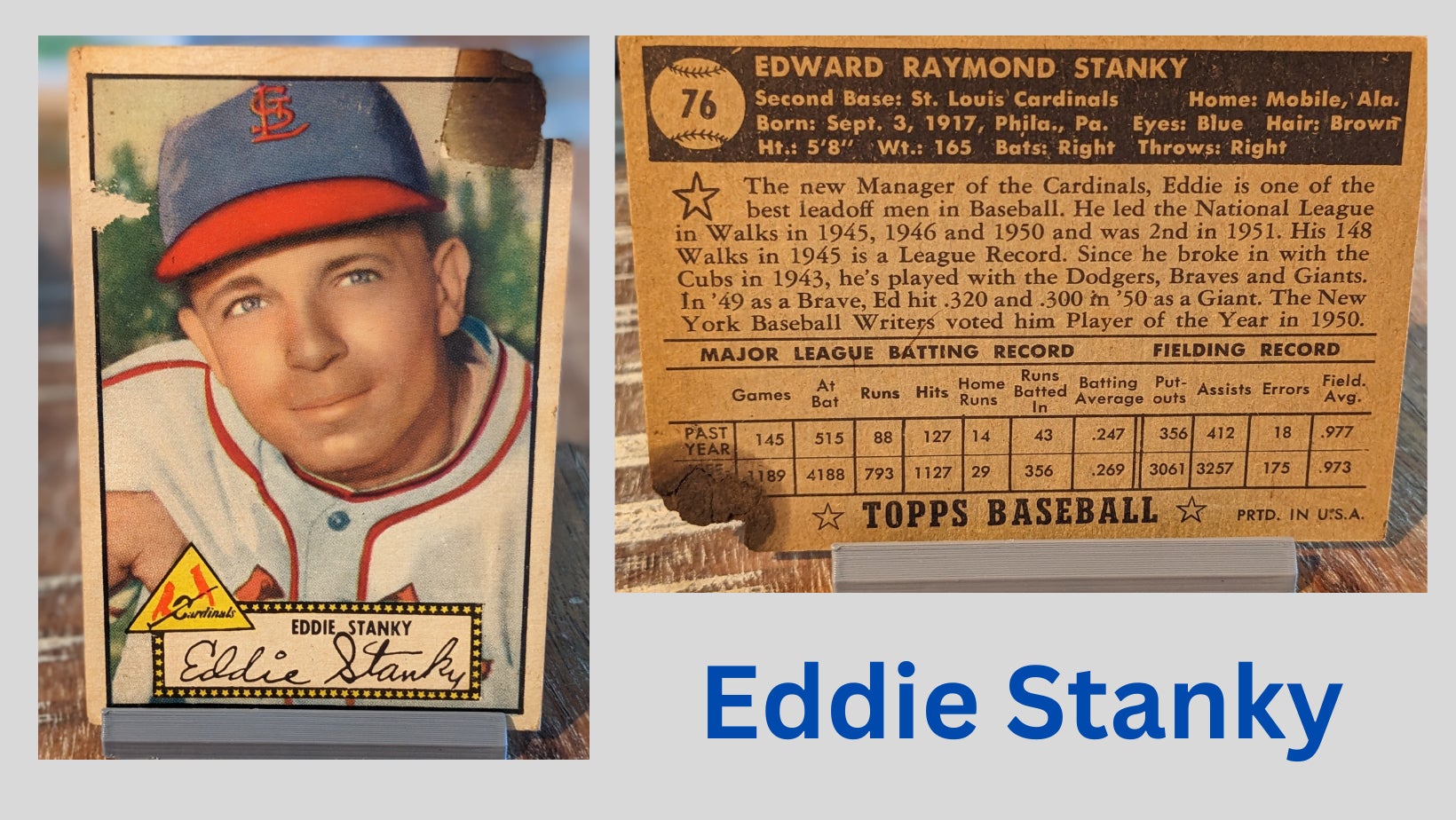 But there's more to my collection than just funny names. There's players with a funny story and a funny name. For instance, I found the stankiest looking Eddie Stanky card replete with a burnt corner that appears to have been attempted to be fixed with tape. Someone probably tried to burn this guy's card into flames and you're about to understand why.