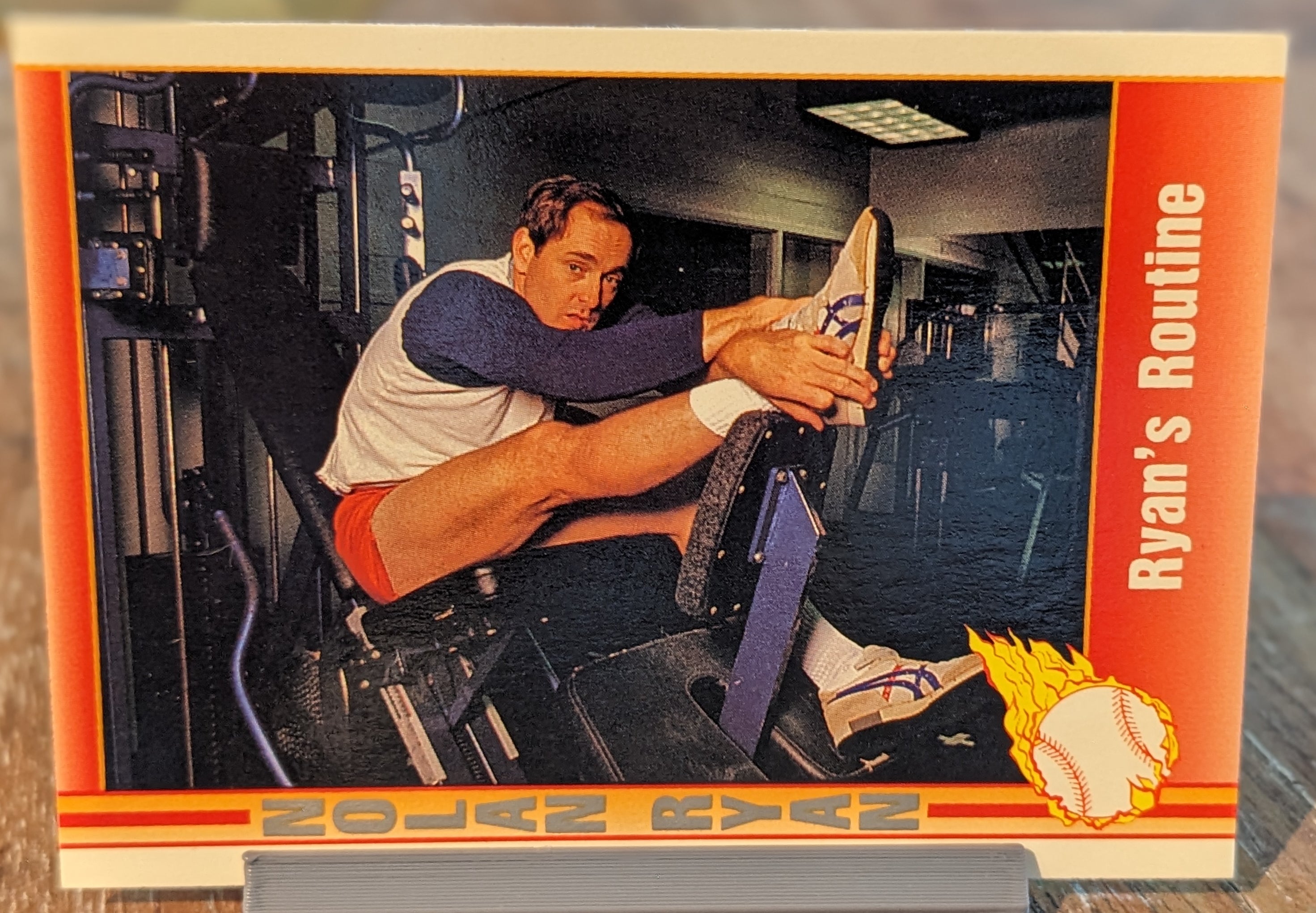 Question for anyone that grew up in the 80s/early 90s. How many ball sacks touched a leg press on a given day at the gym? There's just no way those garters are holding anything in. And absolutely no chance did Nolan authorize this picture. He looks like some kid ran into the locker room with a Polaroid to snap this before he even knew what happened. The fit Nolan must have thrown lead to the card company making it right with perhaps the most badass card photo of all time during that same year.