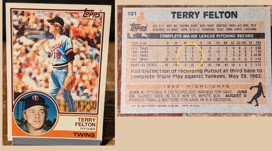 Terry Felton on the other hand would be very much happy if everyone in the world forget he played major league baseball. This 1983 Topps gives his entire career's worth of statistics including the record for most innings pitched and games lost without ever winning.